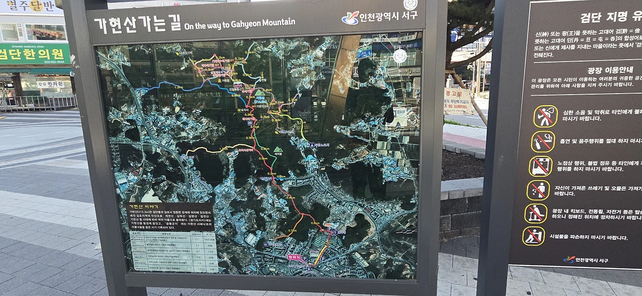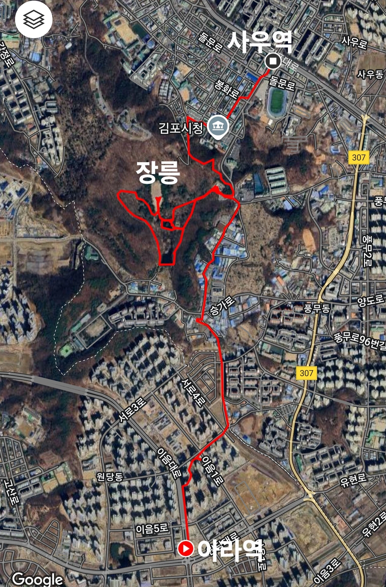 그 후로는 소규모 공장지대였고 국궁장인 현무정을 지나 번화한 검단사거리역에 이르러 산행을 매듭지었다. 장릉 코스에 7.53km, 가현산 산행에 7.63km를 걸은 걸로 기록되었다. 오늘 하루 15km를 터벅터벅 걸었다. 이제 김포장릉이며 검단 지역을 조금은 알 것 같다. 유네스코 세계유산인 장릉과 해발 200미터가 좀 넘는 가현산 같은 곳을 제외하면 택지로 개발되지 않은 곳이 없는 것 같다. 그나마 장릉과 가현산이 최후의 보루처럼 자연을 지켜주고 있으니 얼마나 다행인지 모르겠다.
