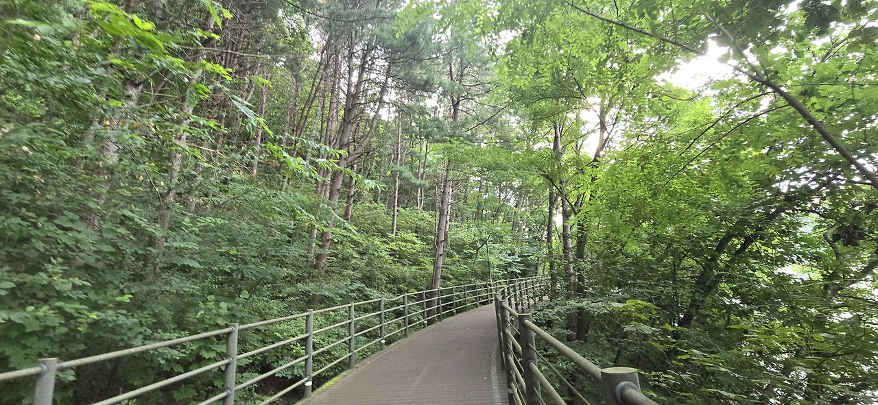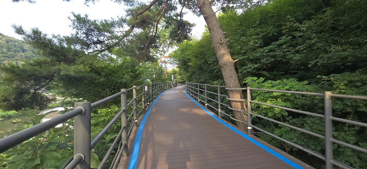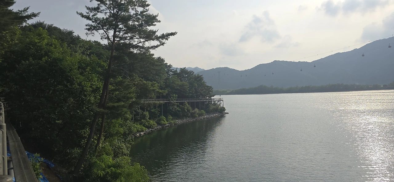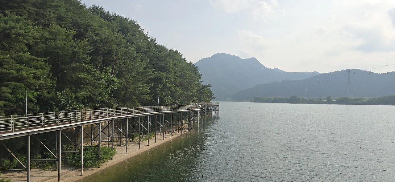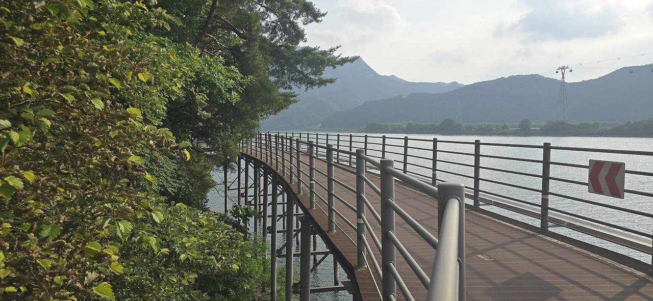 춘천삼악산호수케이블카 타는 곳에 이르러 편의점에서 음료를 사 먹으며 휴식을 취했다. 수분을 충분히 보충하니 다시 힘이 났다. 어디까지 가볼까. 신연교와 의암댐까지 가보나. 그러나 더위가 만만치 않았다. 숲속 데크길을 걸을 땐 그리 힘든 줄 몰랐지만 아스팔트 구간은 무척 힘겨웠다. 숲속 데크길과 아스팔트 구간이 계속 교차하는 행로였다. 결국 의암스카이워크에 이르러 더 갈 맘을 접었다. 조금만 더 가면 신연교, 의암댐인데....