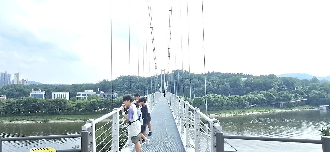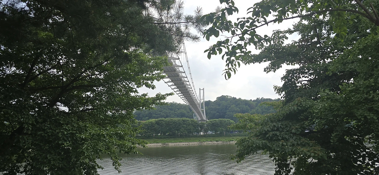 10분쯤 걸었을까, 춘천사이로248이 나타났다. 출렁다리다. 다리 길이가 248m란다. 아주 살짝만 출렁이는 비교적 단단한 다리가 공지천 끝 무렵에 놓여 있었다. 다리를 건너는 기분은 마치 구름 위를 걷는 느낌이었다. 다리를 건너 오른쪽으로 꼬부라지니 갑자기 숲속 데크길이다. 춘천MBC가 왼편 산 위에 서 있었다. 그 아래를 지나니 상상마당이 나타났고 또다시 숲속 데크길이 나왔다. 그러나 곧 다시 긴 아스팔트길이었다. 땡볕과 싸우며 걷다 보니 의암호 하늘 위로 꼬물거리며 움직이는 게 보였다. 케이블카였다.