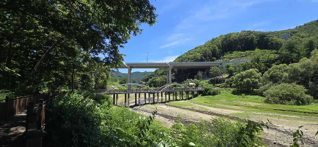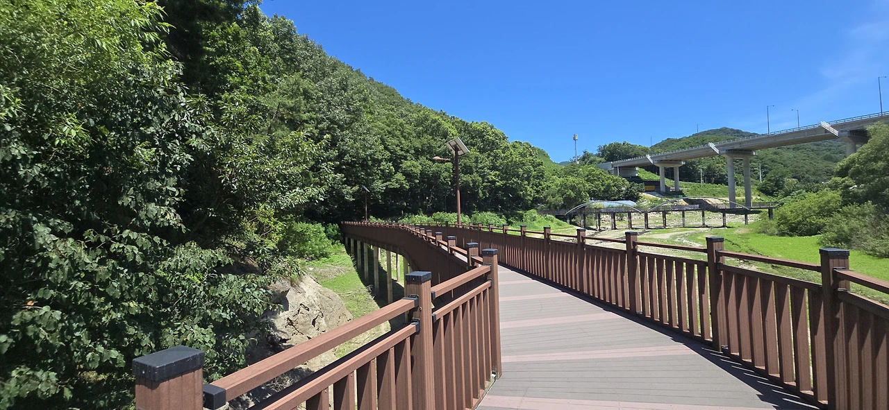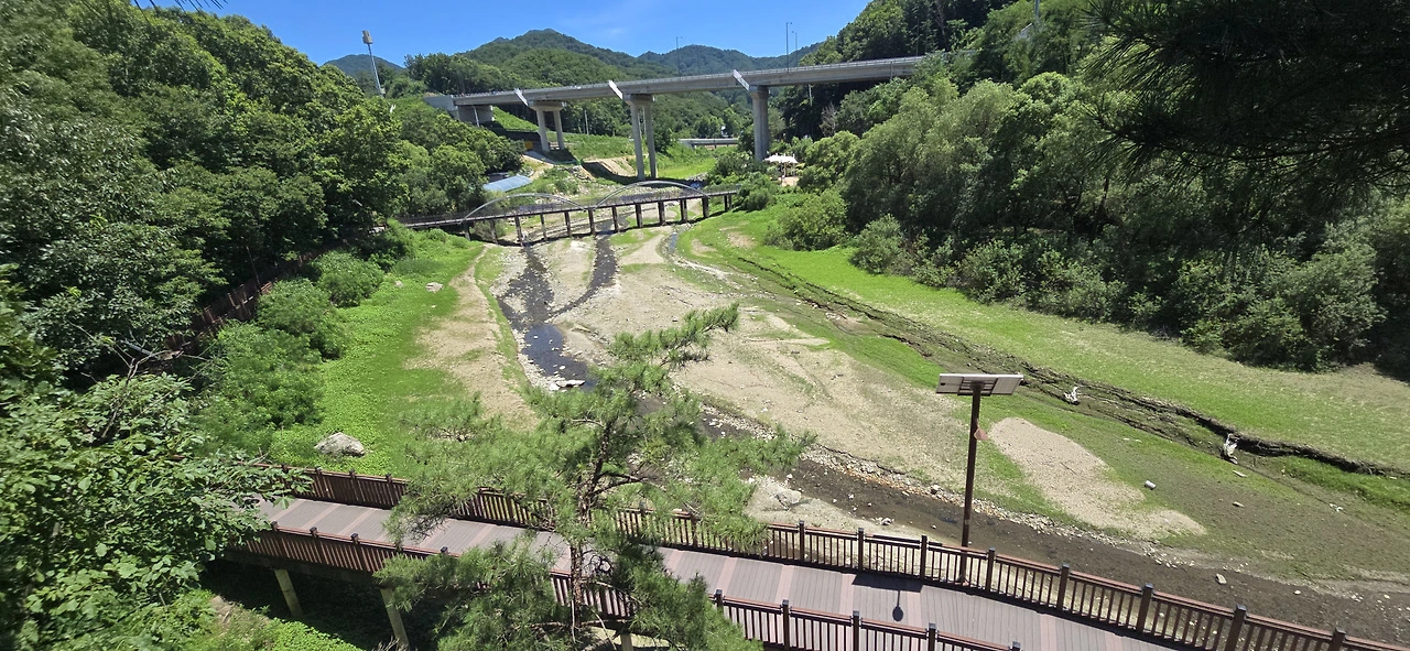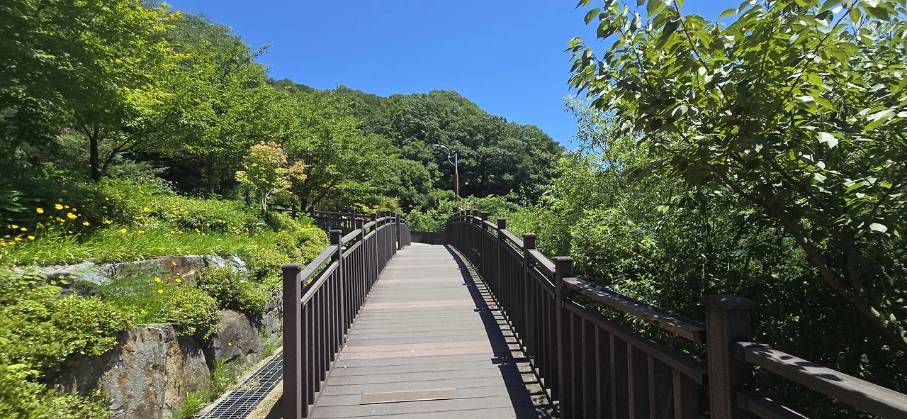 산으로 올라가는 나무계단이 있어 올라가 보았다. 산길로 이어지는 계단이었다. 쉼터가 있어 걸터앉아 휴식을 청했다. 아름드리 소나무들이 주변에 그득했다. 앉아서 쉬는데 서늘한 바람이 어찌나 싱그러운지 도무지 일어나고 싶은 생각이 들지 않는다. 에어컨 바람이 주는 그 써늘한 불쾌감을 이 자연의 소나무 그늘 아래서는 조금도 느낄 수 없다. 에어컨도 이런 순도 높은 쾌적한 바람을 내뿜게 할 수는 없을까. 누가 그런 에어컨을 발명하진 못하는 걸까. 아쉬움을 안은 채 계단을 내려와 다리를 건너 출발지를 향해 걷기 시작했다.