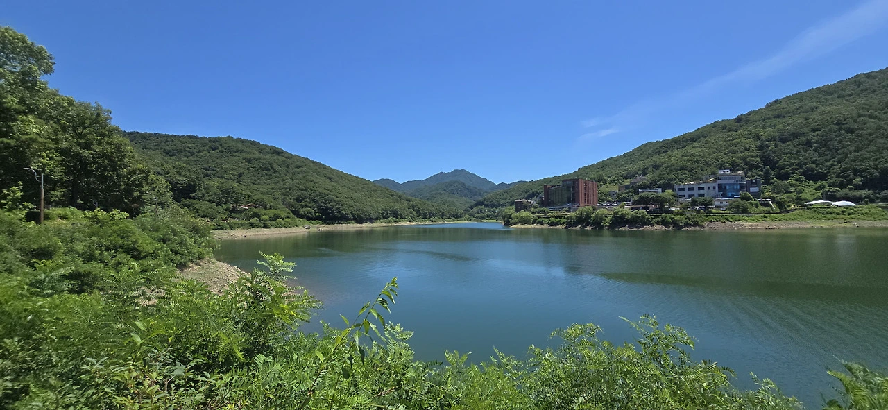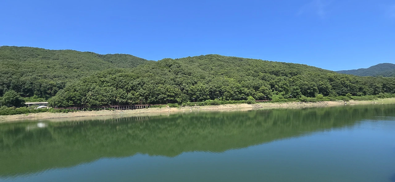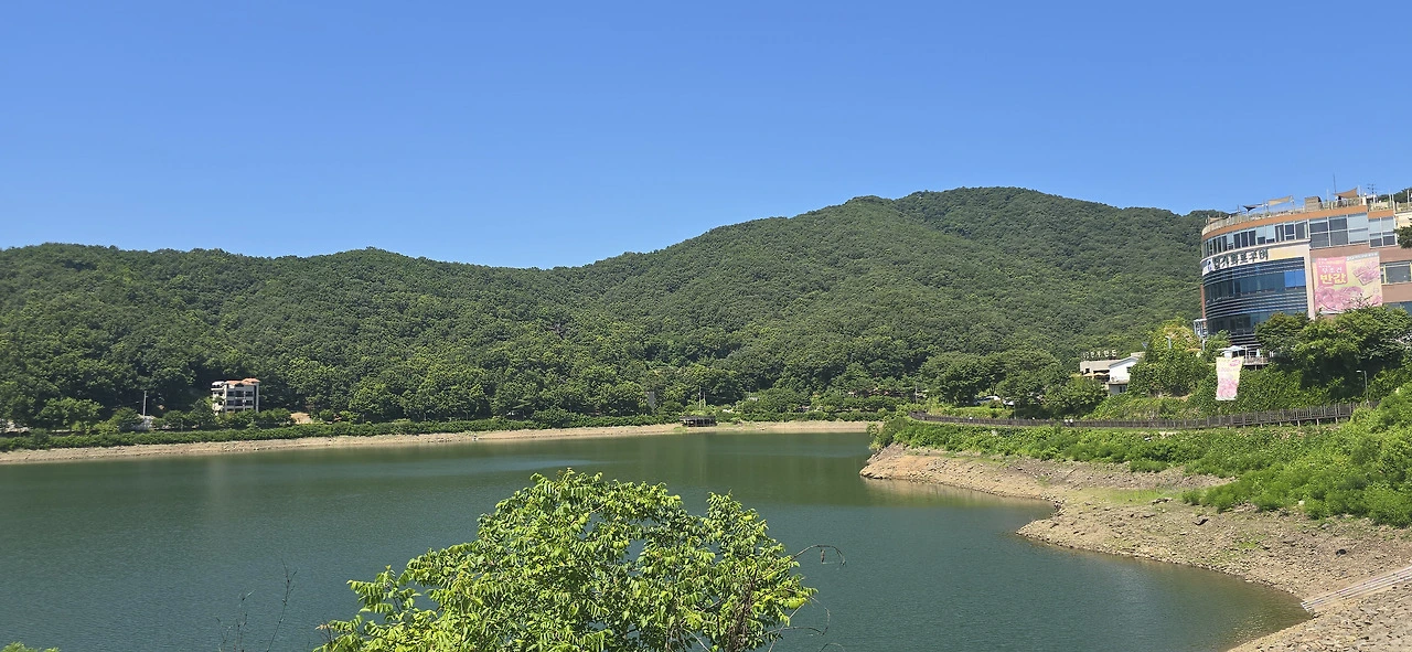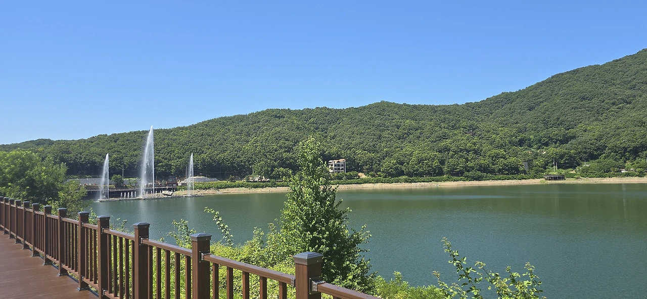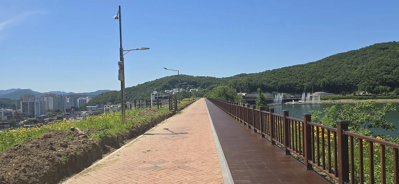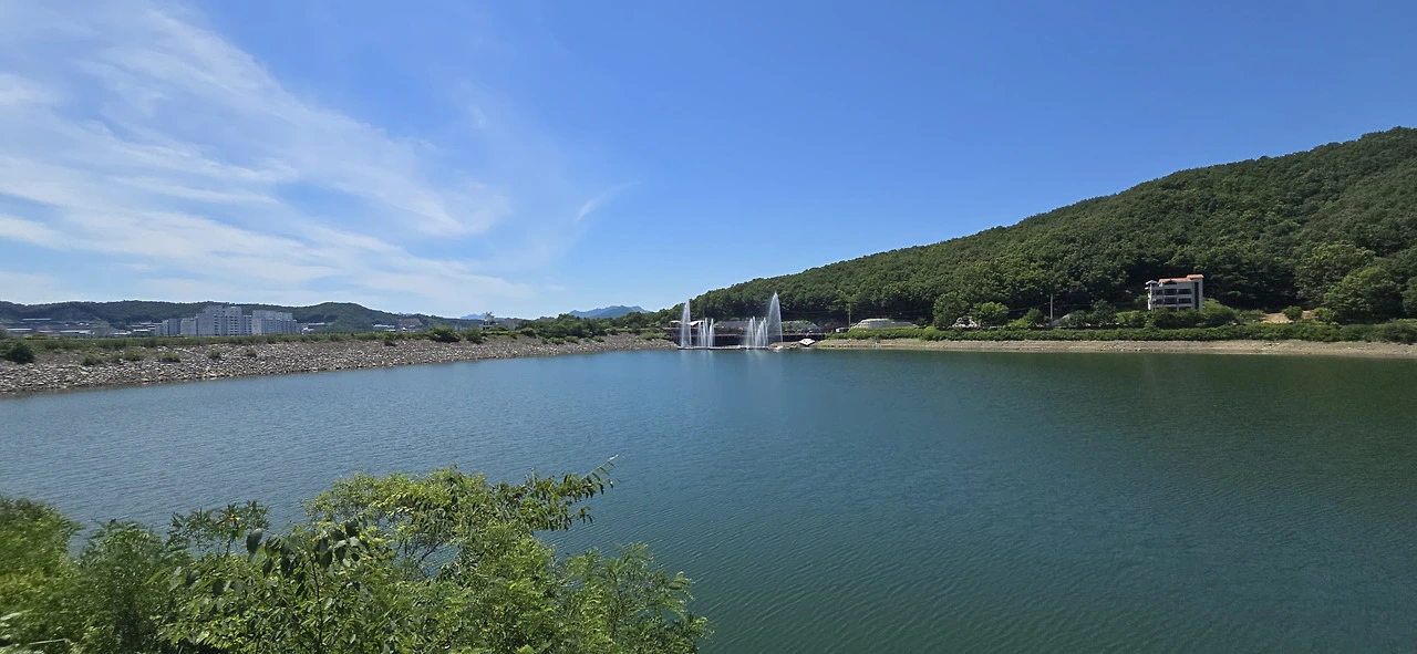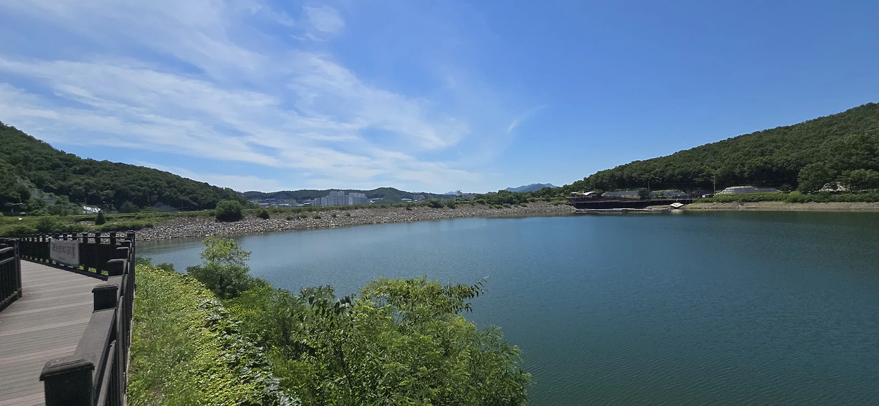 아무리 그렇다고는 하나 낮 최고 35도가 예고된 날씨에 터벅터벅 걷는 게 그리 발걸음이 가볍진 않았다. 해는 뜨거웠고 공기는 습했으니. 30분 이상 걸었으리라. 오남초등학교 앞에 이르렀다. 말하자면 구시가지였는데 놀라움을 금치 못했다. 지금이 2025년이 맞나 싶을 만큼 가로 정비가 안 돼 어수선하기 짝이 없었기 때문이다. 지도 앱을 켜서 드디어 저수지 바로 아래에 이르렀다. 드넓은 주차장이 있었고 화장실도 있었다. 저수지 제방길은 공사중이라 다니지 못한다는 알림판이 곳곳에 붙어 있었다. 우회해서 저수지 수면이 보이는 곳에 올라서자 갑자기 경관이 달라지며 나도 모르게 탄성이 터져 나왔다.