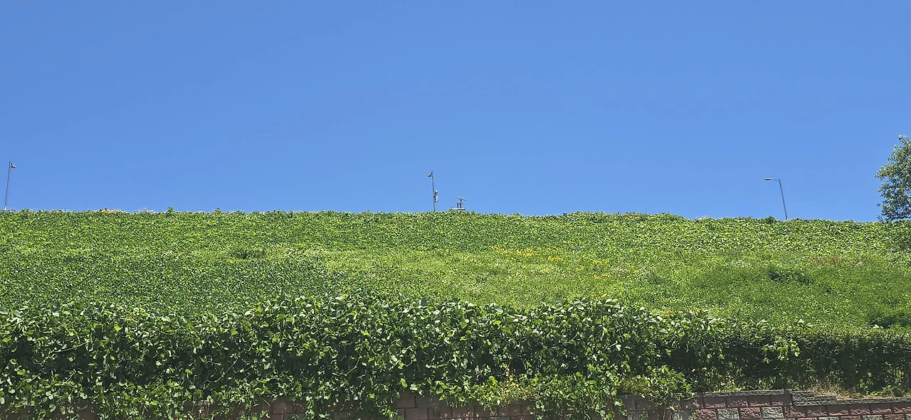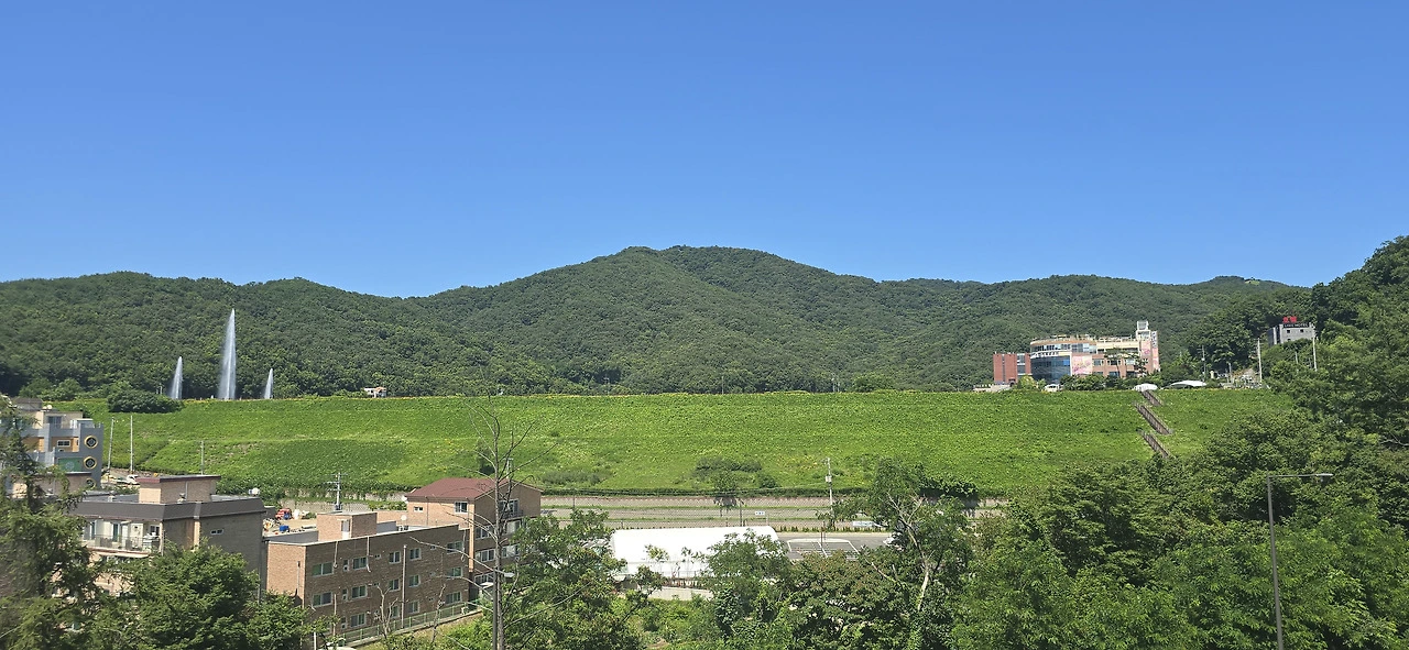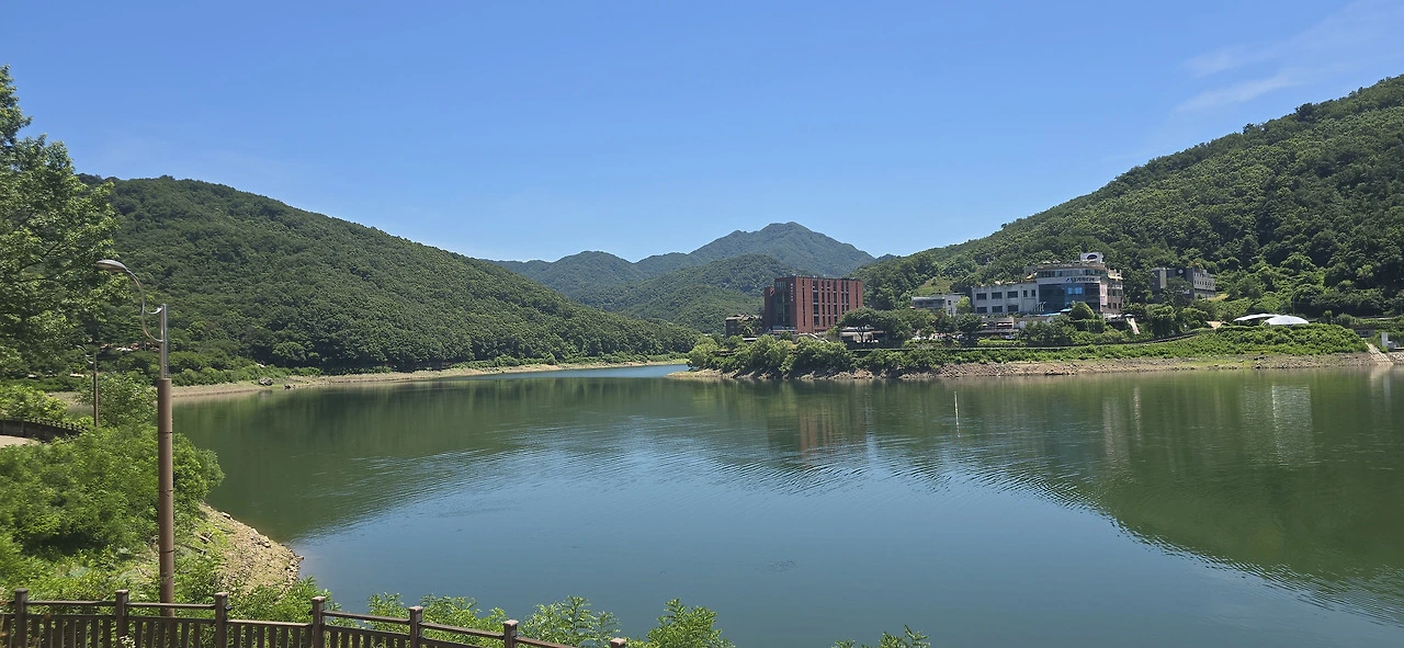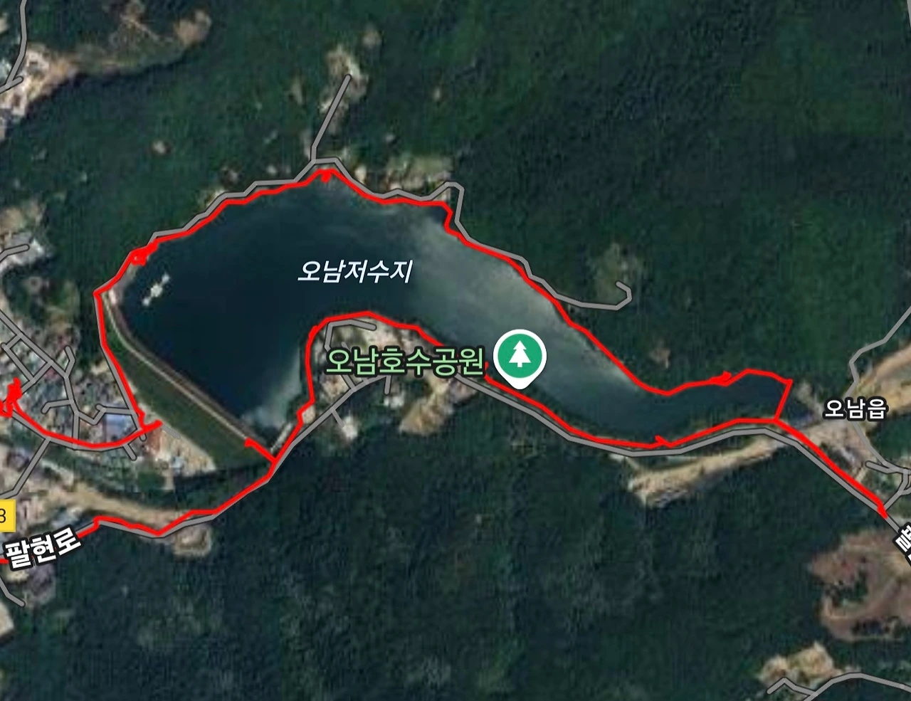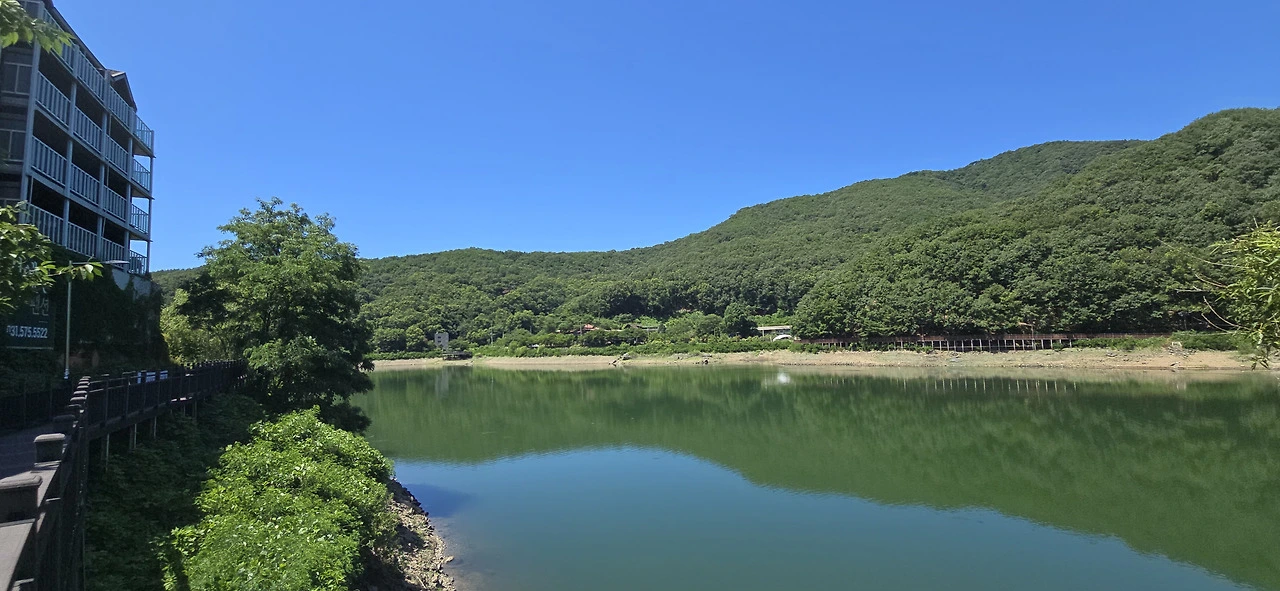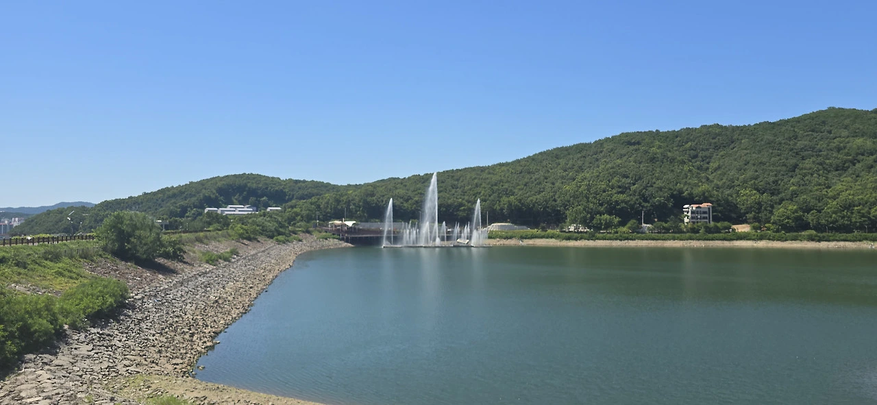 아무리 그렇다고는 하나 낮 최고 35도가 예고된 날씨에 터벅터벅 걷는 게 그리 발걸음이 가볍진 않았다. 해는 뜨거웠고 공기는 습했으니. 30분 이상 걸었으리라. 오남초등학교 앞에 이르렀다. 말하자면 구시가지였는데 놀라움을 금치 못했다. 지금이 2025년이 맞나 싶을 만큼 가로 정비가 안 돼 어수선하기 짝이 없었기 때문이다. 지도 앱을 켜서 드디어 저수지 바로 아래에 이르렀다. 드넓은 주차장이 있었고 화장실도 있었다. 저수지 제방길은 공사중이라 다니지 못한다는 알림판이 곳곳에 붙어 있었다. 우회해서 저수지 수면이 보이는 곳에 올라서자 갑자기 경관이 달라지며 나도 모르게 탄성이 터져 나왔다.