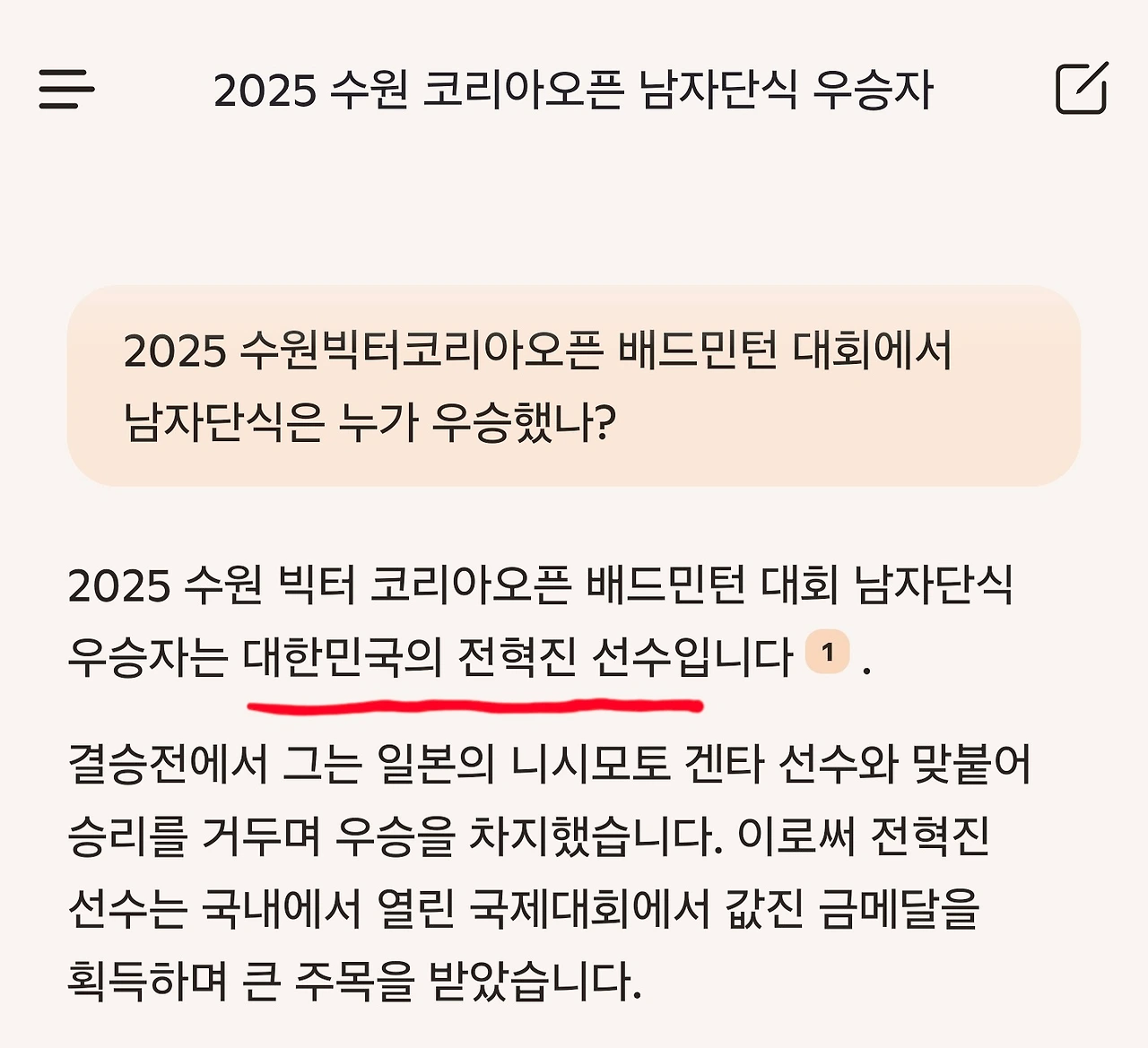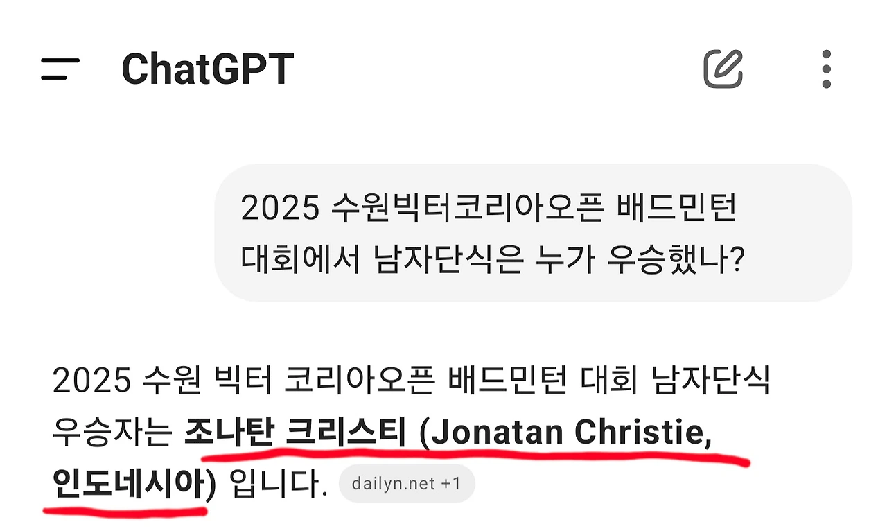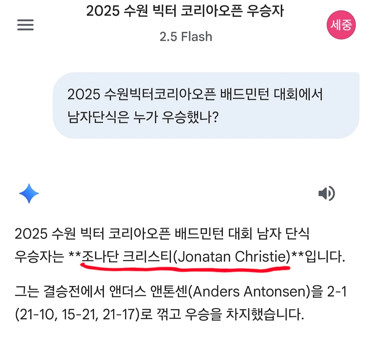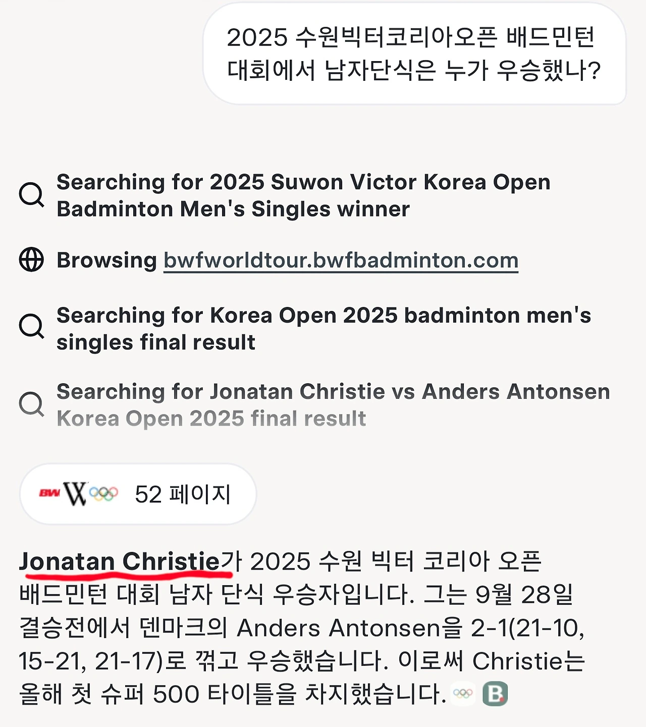 그런데 몇 인공지능은 일제히 인도네시아의 Jonatan Christie가 남자 단식에 우승했다고 답했다. 조나탄 크리스티라 한 데가 있는가 하면 조나단 크리스티라 한 데도 있고 한글 없이 영문으로 Jonatan Christie라 한 데도 있었다. 여러 군데서 이렇게 말하니 조금 믿음이 가려고 했다.