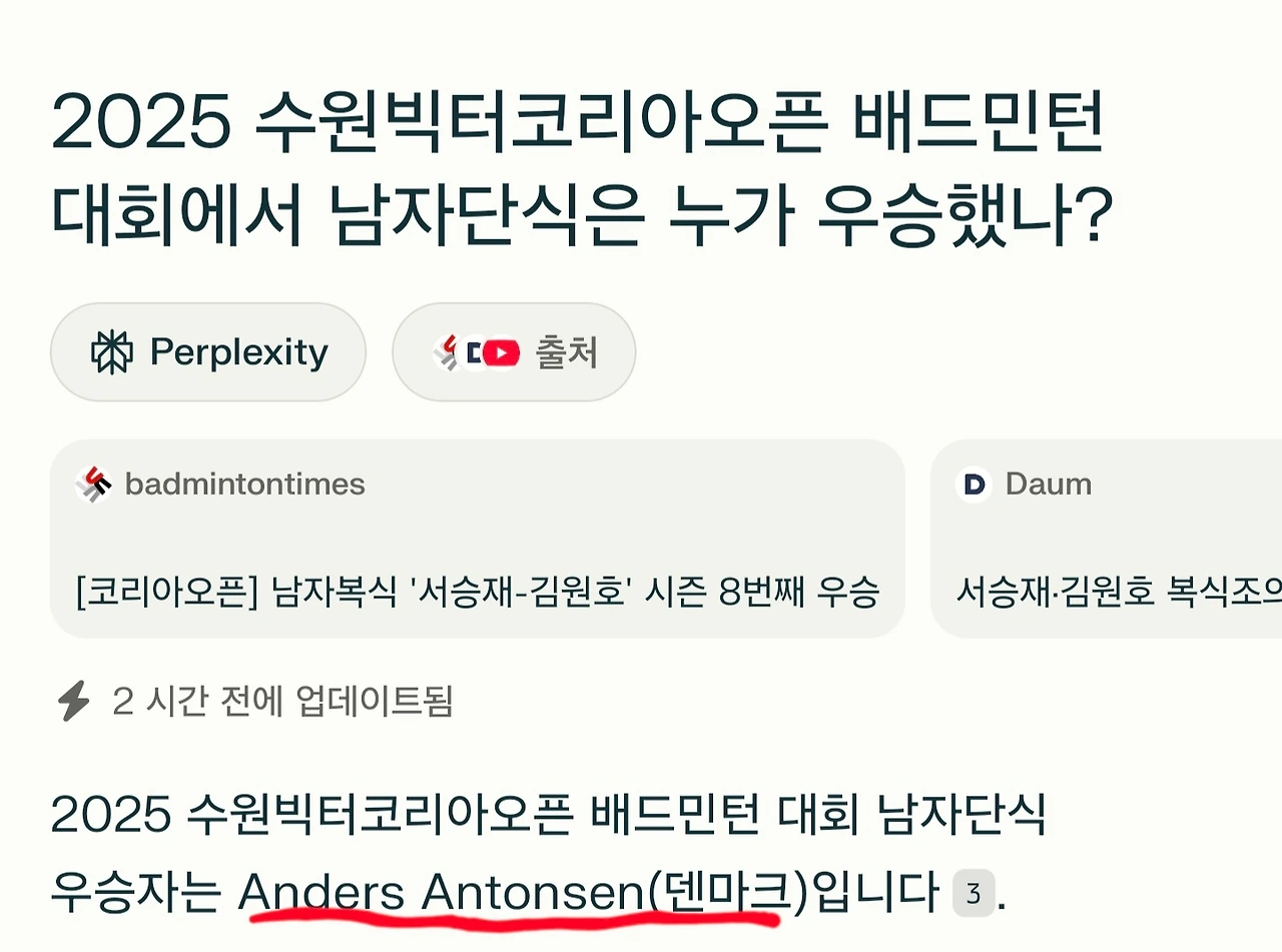 그러나 다른 대답을 한 데도 또한 있었다. 덴마크의 Anders Antosen이 우승했다는 것이다. 다음과 같다. 그런데 이 Anders Antosen은 앞에서 Jonatan Christie가 우승했다고 답한 인공지능의 답에서는 준우승한 이다. 아마도 덴마크의 Anders Antosen은 준우승한 게 맞아 보인다.