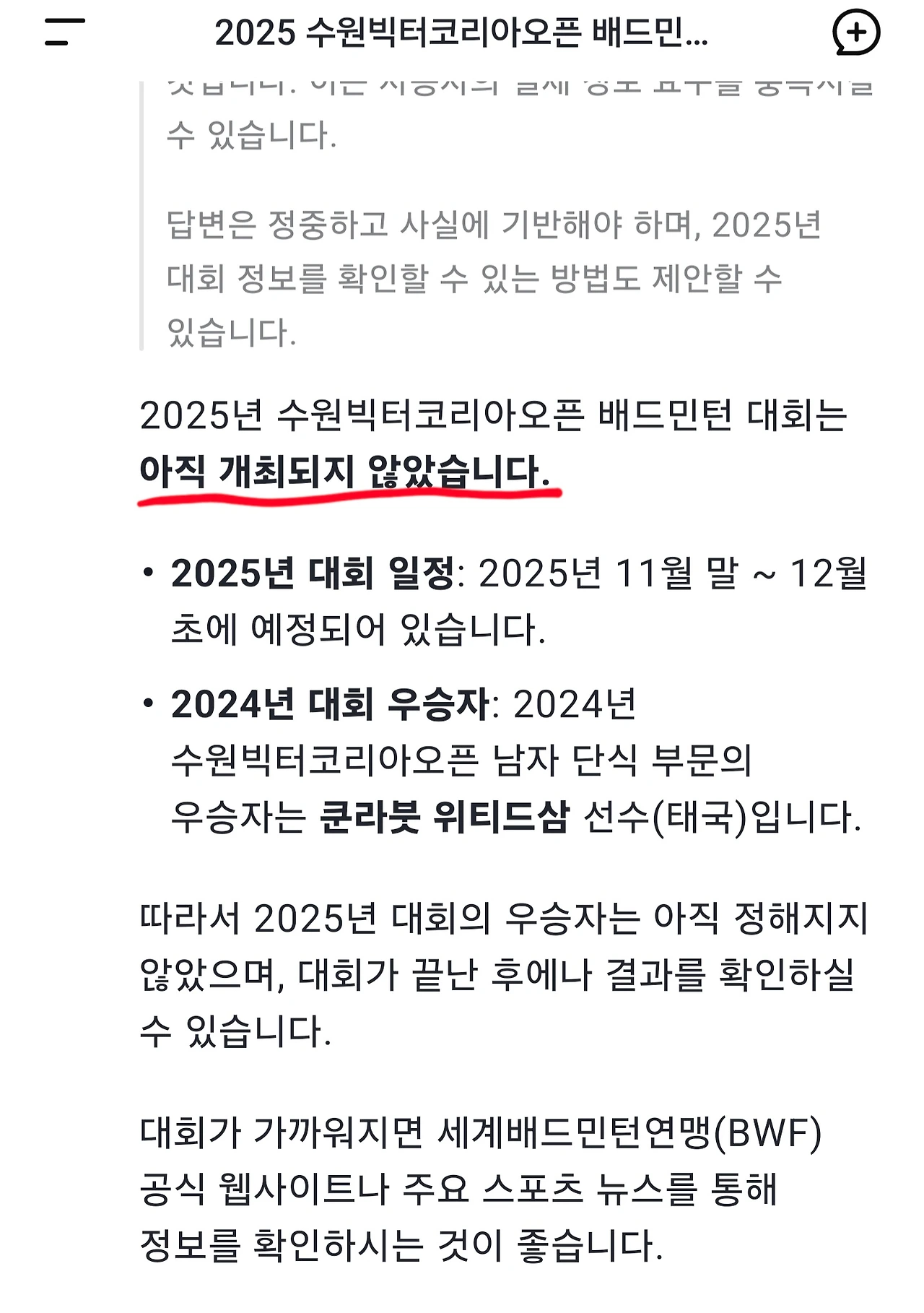 필자를 배꼽 잡게 한 인공지능이 있었다. 세계를 떠들썩하게 놀라게 했던 중국의 딥시크이다. 딥시크는 이렇게 말했다. 수원빅터코리아오픈 대회는 아직 개최되지 않았으며 2025년 11월말~12월초에 개최 예정이라고 했다. 환각도 이 정도면 혀를 내두르게 한다. 왜 이런 딥시크에 세계가 열광했는지 모르겠다.