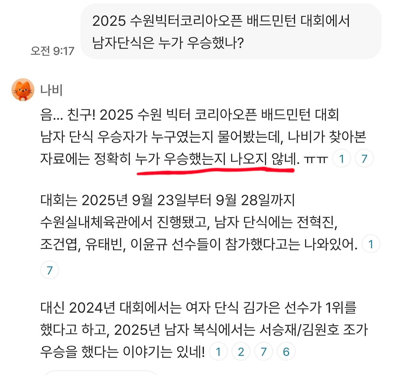 그런데 궁금증이 들었다. 남자단식은 누가 우승했나? 남자단식에 대한 뉴스는 좀체 찾아볼 수 없었다. 만일 한국 선수가 남자단식 결승에 진출했다면 보도가 없었을까. 물으나마나 매우 떠들썩했을 것이다. 결승에서 이겼든 졌든. 그러나 한국 선수는 남자단식에 4강에도 들지 못했다. 남자단식 주요 경기에 한국 선수가 없어서인지 남자 단식 우승자가 누구인지는 기사 검색에서 잘 보이지 않았다. 궁금증을 이기지 못해 인공지능에 물어보기로 했다. 그리고 나는 쓴웃음을 짓지 않을 수 없었다. 온갖 답이 다 튀어나왔기 때문이다. 얼마나 다양한 답을 인공지능이 쏟아냈는지 한번 보자.