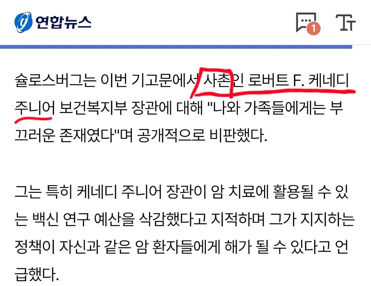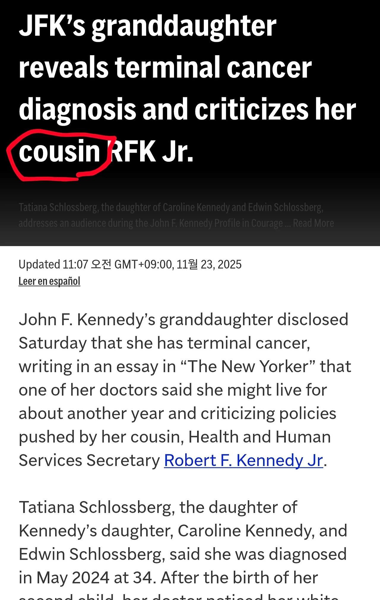 오늘 케네디 대통령의 외손녀 슐로스버그가 암에 걸려 시한부 인생 판정을 받았다는 기사가 났다. 연합뉴스는 이 기사에서 슐로스버그가 사촌인 로버트 F. 케네디 주니어 보건복지부 장관을 비판했다고 했다. 순간 뭔가 이상함을 느꼈다. 케네디 대통령의 외손녀와 로버트 F. 케네디 주니어가 사촌이라고? 분명 아니다. 케네디 대통령의 외손녀와 로버트 F. 케네디 주니어가 사촌이 아니고 케네디 대통령의 딸, 즉 슐로스버그의 어머니 캐럴라인 케네디와 로버트 F. 케네디 주니어가 사촌이다. 그러니까 슐로스버그와 로버트 F. 케네디 주니어는 사촌이 아니다. 오촌이다.