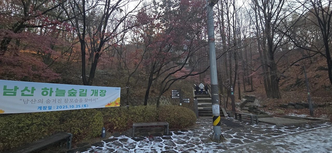 남산 정상에 오르는 방법은 많다. 버스를 타고 갈 수도 있고 케이블카를 타고 갈 수도 있다. 걸어서 간다면 한양도성유적전시관에서 잠두봉 지나 오르는 게 전통적으로 가장 빠른 길이었다. 그런데 남산북측숲길이 새로 생겼다. 최근 생긴 남산하늘숲길은 남산 정상 가기엔 그리 적합하지 않을지 모른다. 꽤나 돌아가야 하기 때문이다. 그러나 숲길만을 즐기고자 한다면 아주 환상적이다. 도중 곳곳에 쉬어서 갈 수 있는 벤치가 놓여 있다. 명품길로 인정한다.