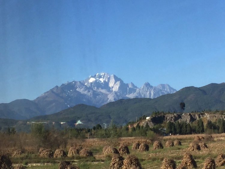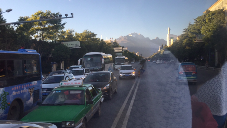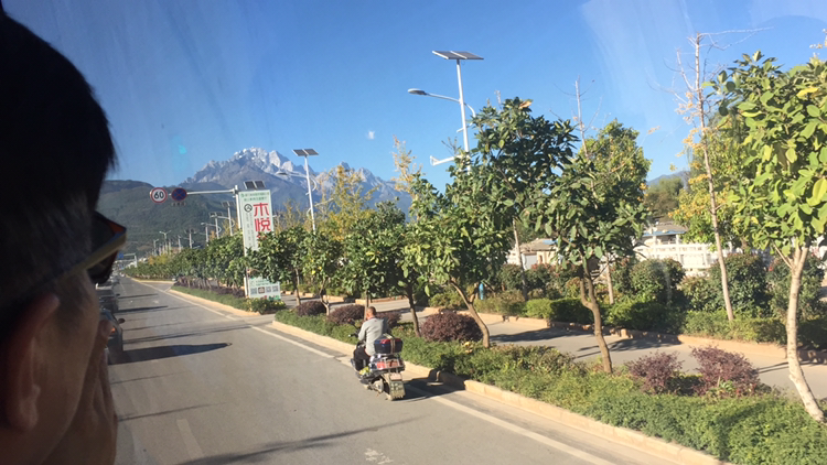 버스는 공항을 빠져나와 시내를 향해 달리기 시작했다. 창 밖으로 운남성의 산야가 펼쳐졌다. 산에는 송전탑들이 곳곳에 심어져 있었다. 여강 시내가 가까워지니 옥룡설산이 더욱 크게 보였다. 산꼭대기는 눈으로 덮여 있었다. 해발 5,596미터의 고산답다.