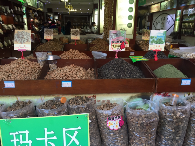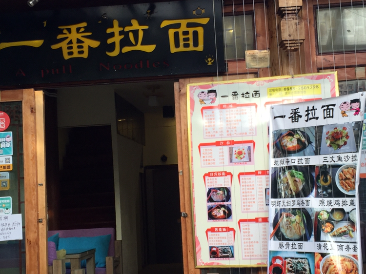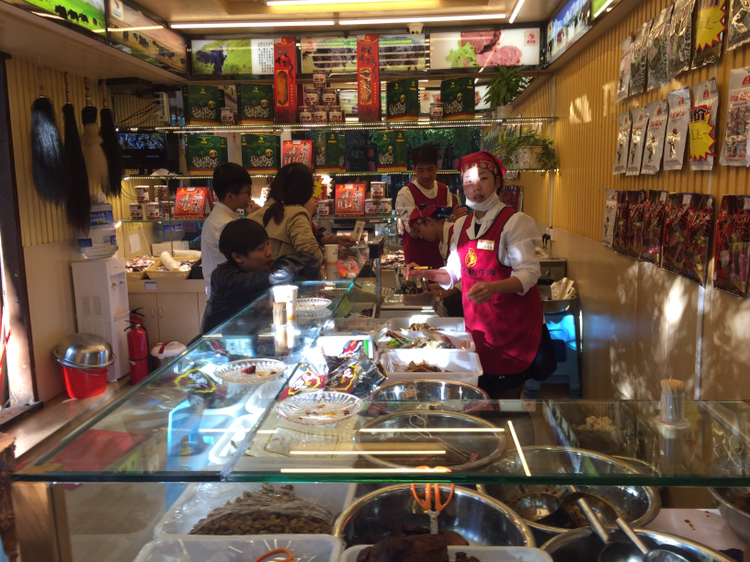 호텔에서 저녁을 먹고 나오긴 했지만 색다른 먹거리를 체험해 보기 위해 어느 가게로 들어갔다. 가게 의자가 여간 낮지 않다. 어린아이들이나 앉을 그런 낮은 의자에 걸터앉아 비빔국수를 사먹었다. 가게 안에는 동물 뼈다귀도 걸려 있었다. 일행은 저 뼈다귀가 무슨 동물의 것일까 모두 궁금했다. 소라 하기엔 너무 작다. 개일까? 양일까? 궁금해 주인에게 몸짓으로 무슨 동물이냐 물으니 주인이 猪라고 써 보였다. 돼지임을 그제서야 알았다. 돼지뼈가 제법 작다.