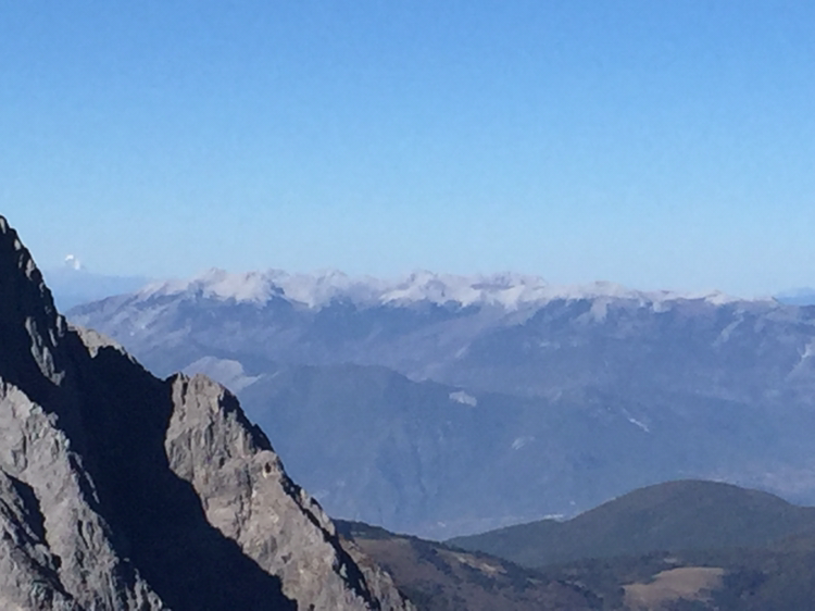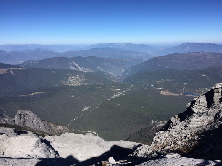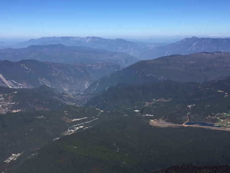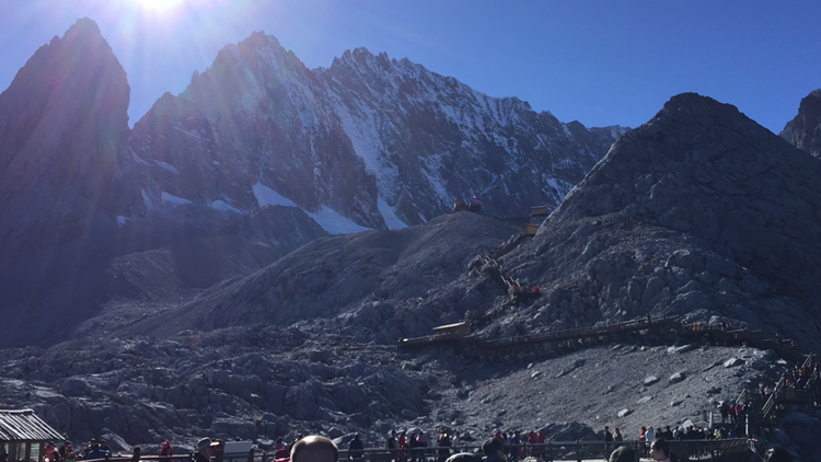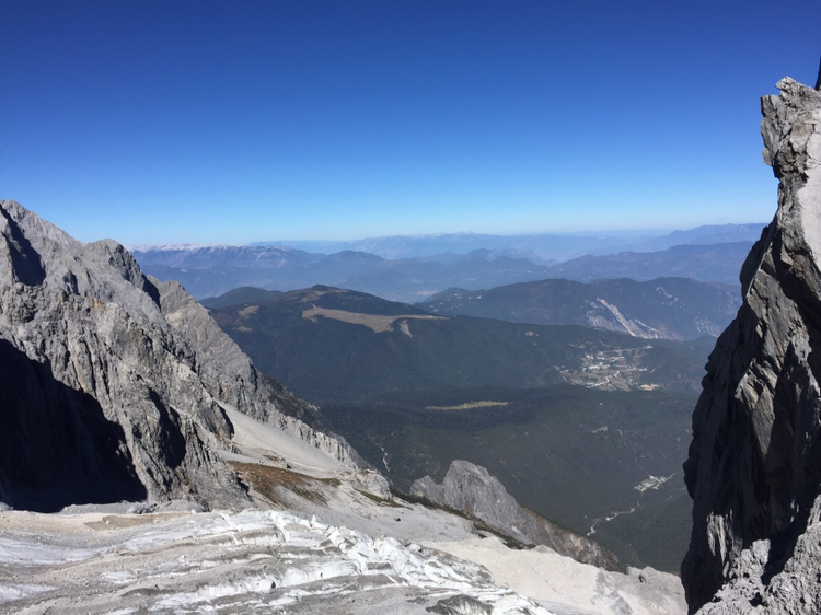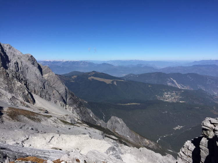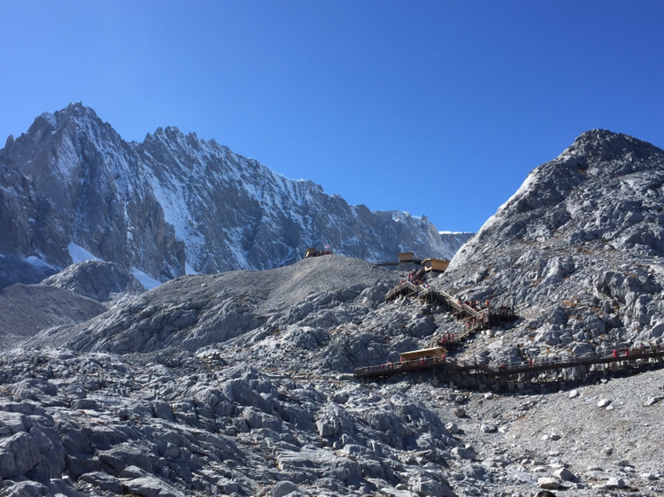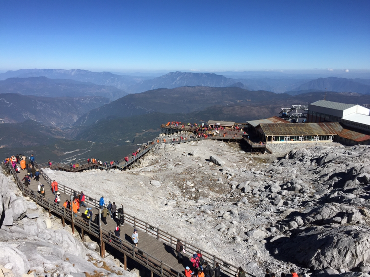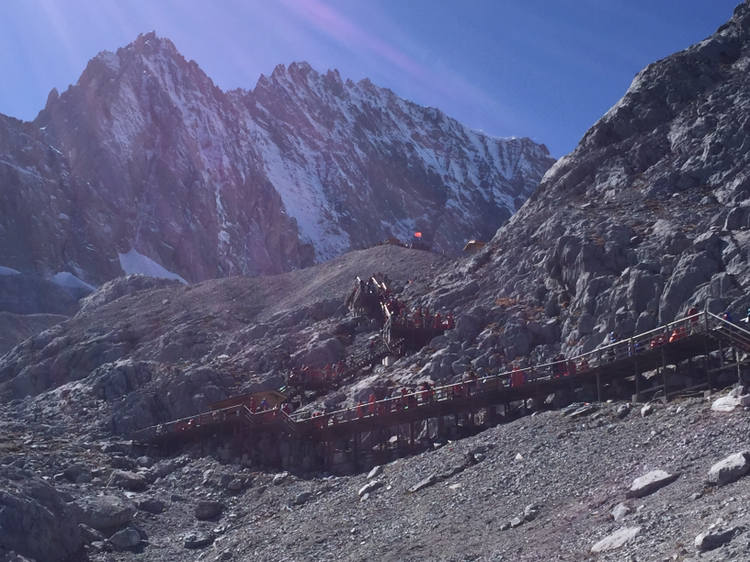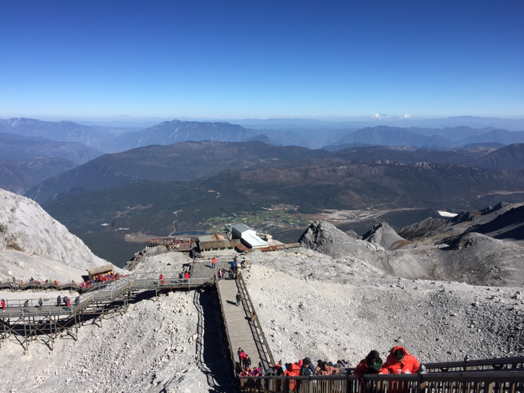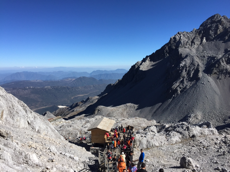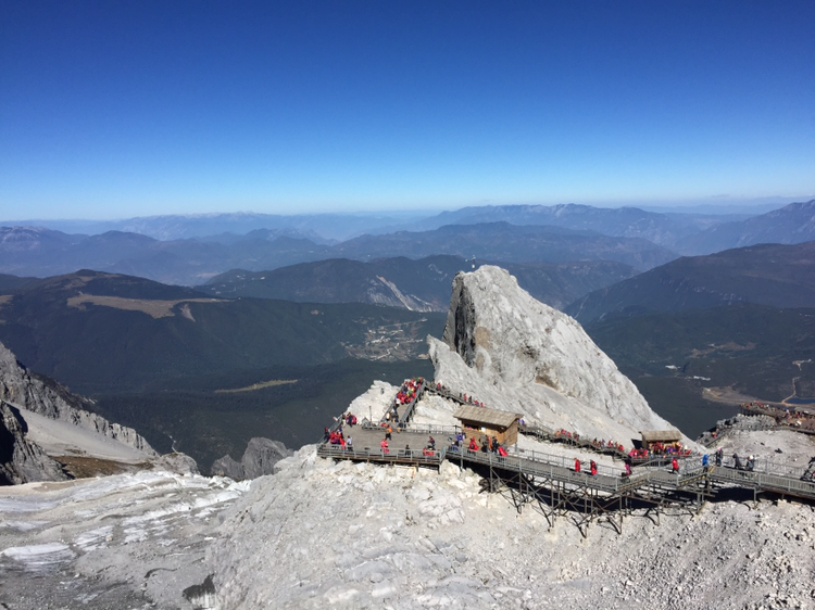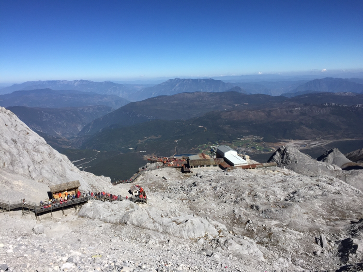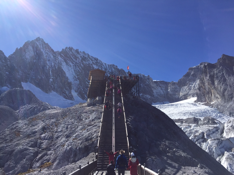 손에 잡힐 듯 가까이 보였던 그곳에 오르기가 만만치 않았다. 나는 더구나 산소통도 마다 하지 않았나. 특히 마지막 계단은 왜 그리 지루하던지! 한 칸 한 칸 차근차근 오르니 결국은 4,680미터 전망대에 오를 수 있었다. 더 위로는 길이 없었다. 주변엔 빙하처럼 보이는 지형이 가까이 있었다. 바람은 세찼고 기온은 겨우 영하를 면할 정도였다. 모자가 날아갈까봐 피가 통하지 않을 정도로 끈을 단단히 조여맸다. 저 멀리 하바설산이 보였다. 서쪽은 하바설산을 비롯해 산들이 연이어 줄지어 있었다. 저 멀리 아득히 티벳과 히말라야가 있을 것이다. 여강 시내는 산에 가려져 보이지 않았다. 우리가 셔틀버스 기다리던 곳은 까마득히 아래에 있었고 산등성이에 희미하게 셔틀버스가 올라오는 길이 보였다. 날씨가 맑아 시야는 깨끗했다. 운이 좋은 것 같다. 비라도 왔거나 구름이 많이 끼었다면 이런 모습을 어떻게 보겠는가. 더 오래 머무르고 싶었지만 가이드가 4시까지 모이라 했기에 하산을 서둘렀다.
