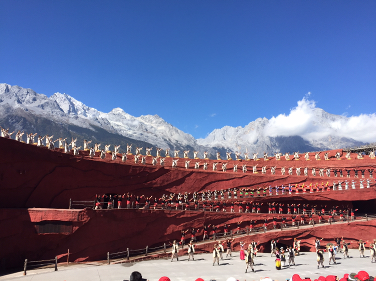 11시 10분부터 시작되는 인상여강(印象麗江) 쇼를 관람하게 돼 있었다. 공연장으로 갔다. 야외 노천 공연장이었다. 규모가 상당히 컸다. 천 명 이상이 족히 앉아서 볼 수 있는 시설이었다. 도대체 어떤 공연이 펼쳐질까 궁금했다. 정확히 11시 10분에 공연이 시작됐다. 시설은 현대화돼서 연극 공연장에 설치돼 있는 전자 전광판이 그곳에 있었다. 드디어 무대 안으로 연기자들이 들어오기 시작했다. 한 명씩 나와서 "나는...."으로 시작해 자기를 소개하는 듯했다. 어디 사는 무슨 족이라고 했을 것이다. 저마다 자기 소개를 했다. 서서히 공연이 무르익기 시작했다. 남자들이 수십 명 나왔다가 들어가더니 그들이 물러가고 난 다음 여자들이 수십 명 고유 의상을 입고 들어왔다. 꼭대기에서는 말을 타고 줄지어 들어오기도 했다. 가히 입체적인 공연이었다. 대단했다. 더욱이 공연장 밖은 바로 눈으로 뒤덮인 옥룡설산이지 않은가. 이런 배경을 지닌 야외공연장이 또 어디 있을까. 공연은 이 깊은 산속에서 살아가는 운남성 소수민족들의 삶을 잘 보여주고 있었다. 남자들은 힘찬 기상을 보여줬고 여자들은 부지런히 살아가는 모습을 보여줬다. 공연은 꼬박 한 시간 계속됐다. 때로는 관중석까지 들어와 생생한 모습을 보여주기도 했다. 드디어 공연이 끝났다. 좀 길긴 했어도 대단한 공연이었다.