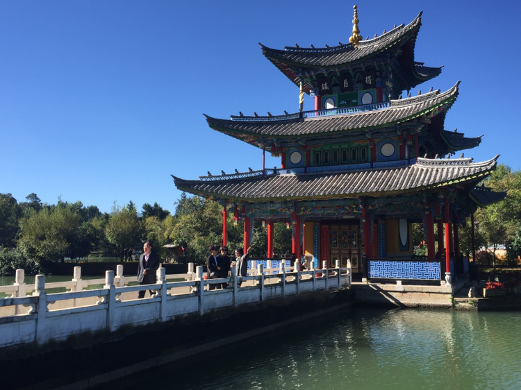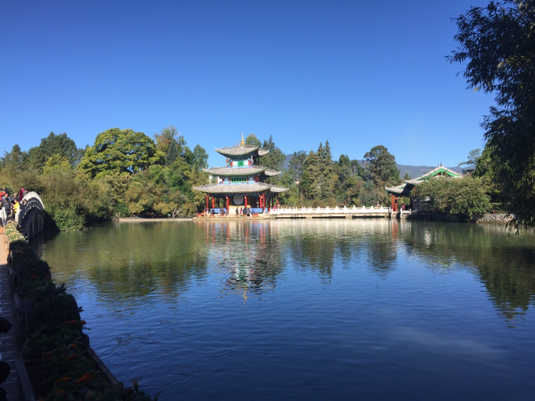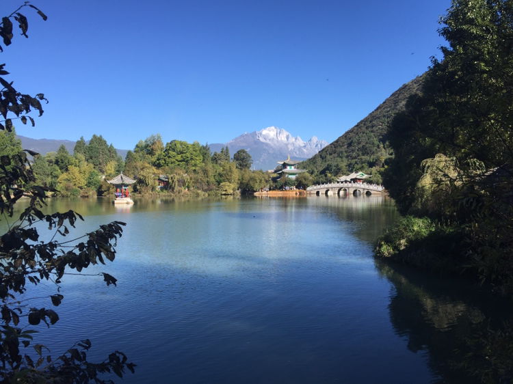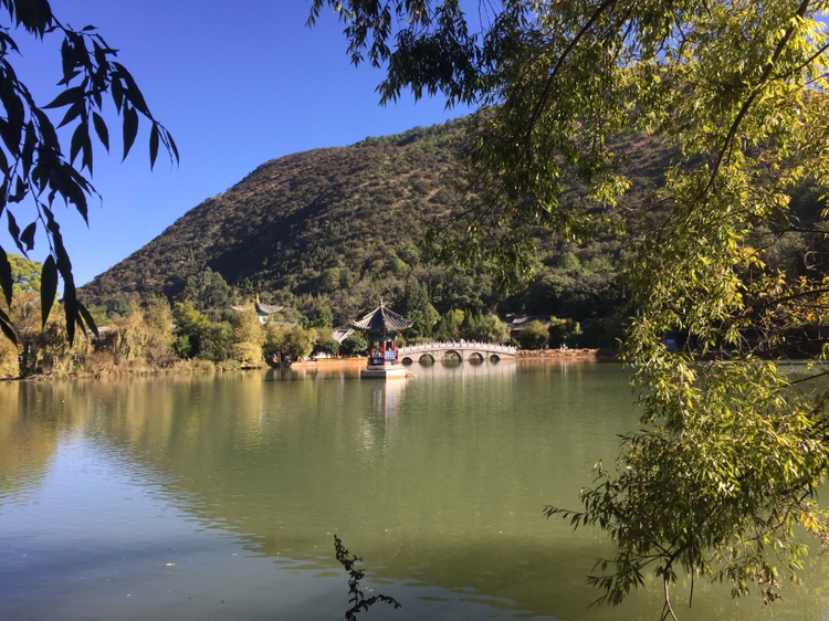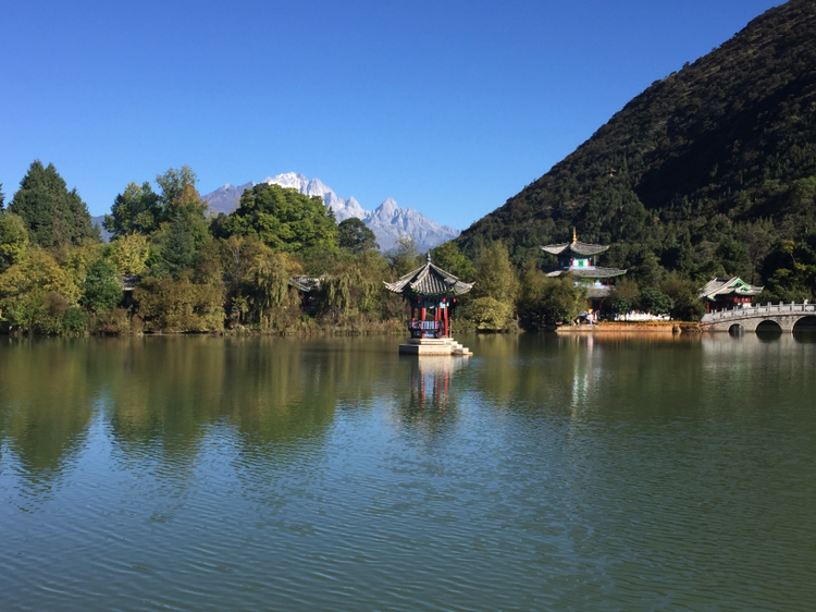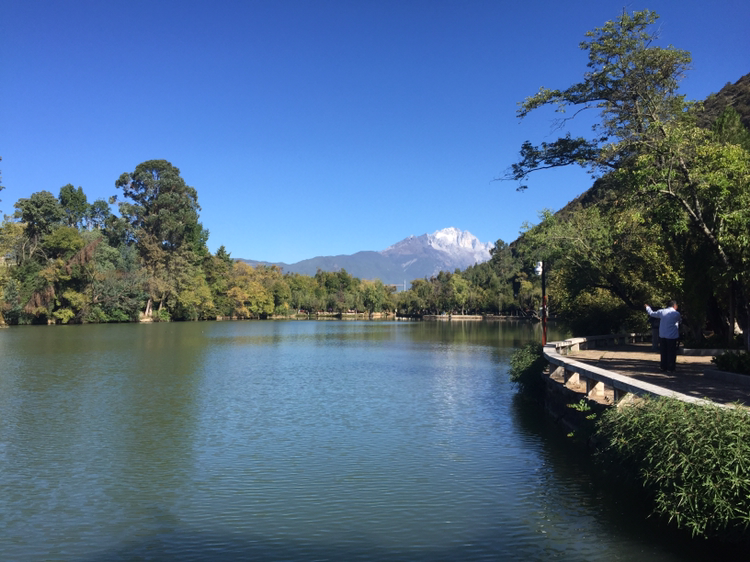 버스에 올라 흑룡담공원으로 갔다. 흑룡담공원 안에 들어서니 호수가 나타났다. 참 고요한 분위기다. 저 멀리 옥룡설산이 버티고 있었다. 여강 시내에선 어디서나 옥룡설산이 보이는 것 같다. 그만큼 산이 높다. 5,596미터가 장난이 아닌 게다. 30분 가량 주어진 자유시간 동안 흑룡담공원을 거닐었다. 득월루(得月樓)까지만 갔다. 공원 곳곳에 춤 추는 듯이 체조하는 이들이 있었다. 혼자서건 여럿이건... 한 할머니가 혼자 하고 있었는데 수준이 보통 아니어 보였다.