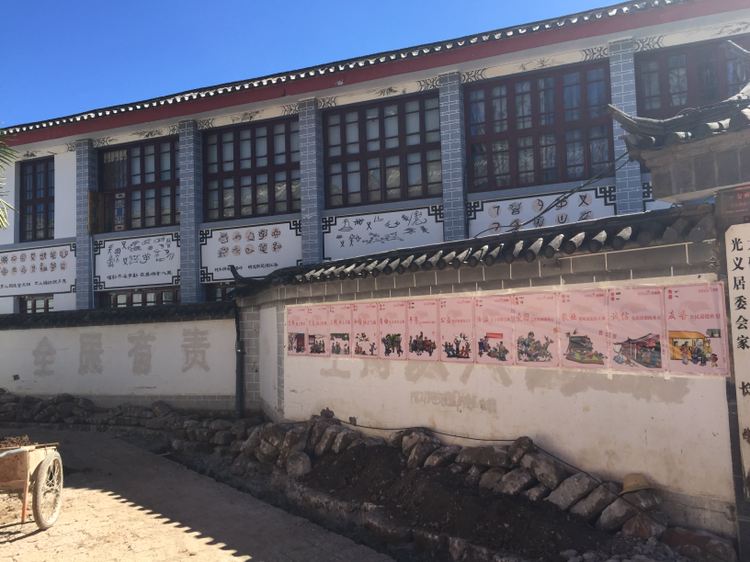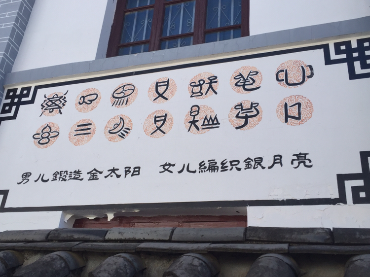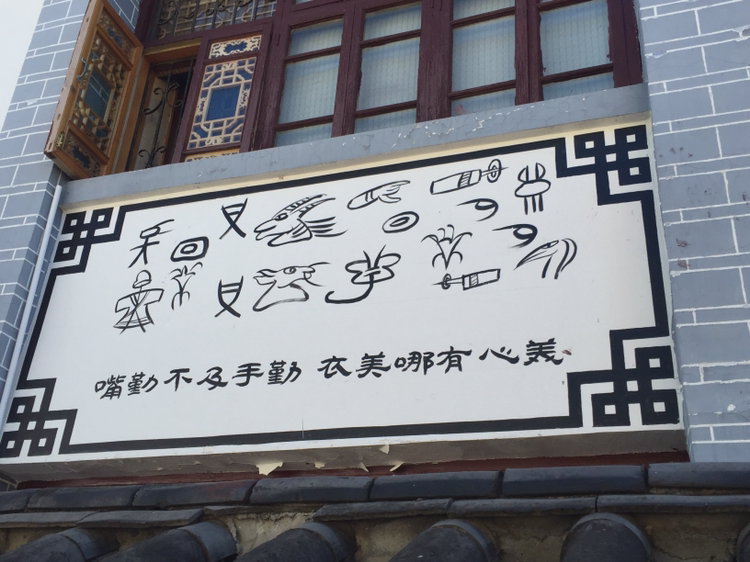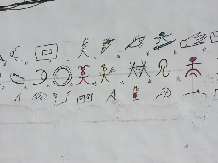고성 안의 목부 부근에는 초등학교가 있었다. 담벼락에 나시족의 상형문자가 붙어 있었다. 한문으로 중국어가 씌어 있고 나란히 나시족 사형문자가 번역돼 있는 듯했다.