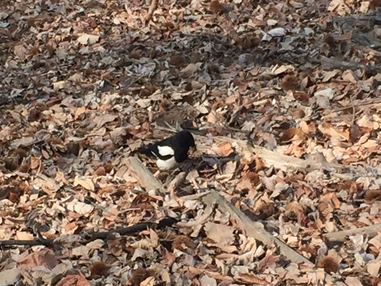 까치가 여기저기서 모이를 쪼고 있었고