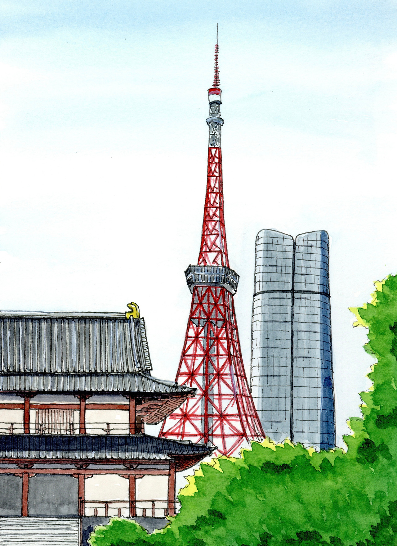 조용한 풍경에 포인트가 있다면 대전 뒤로 보이는 빨간 탑, 도쿄타워다.