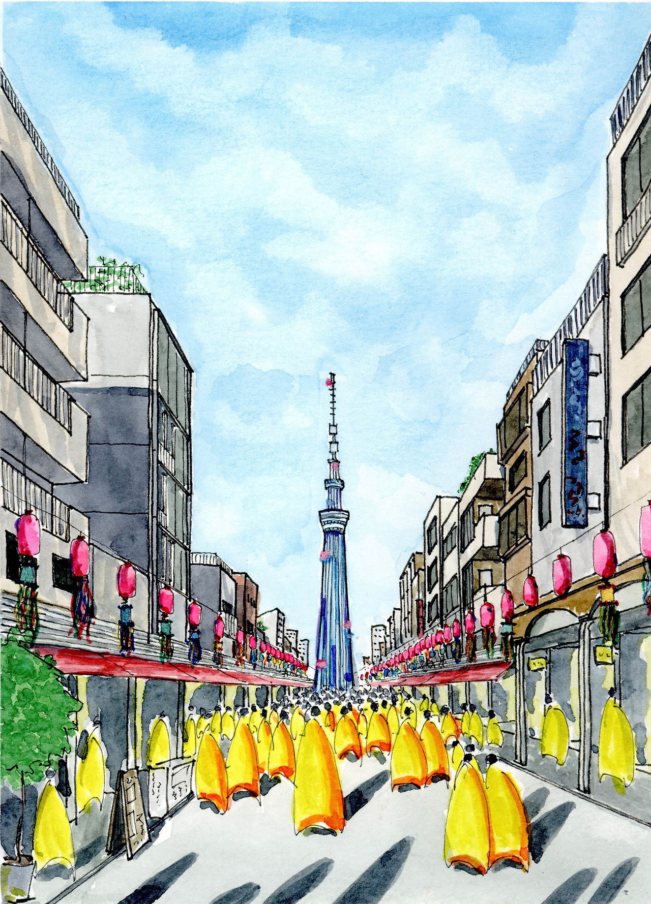 7월 7일 일요일, 갓파바시거리는 사람들로 북적였다. 행진이나 공연 등의 메인 이벤트는 이미 끝난 시간이었지만 색색의 거리장식과 길거리 음식들은 축제 분위기를 느끼기에 충분했다. 1km 이상 계속되는 핑크색 축제등과 세계에서 가장 높은 전파탑인 스카이트리, 수평을 달리는 등과 수직 타워의 구도가 인상적이다.