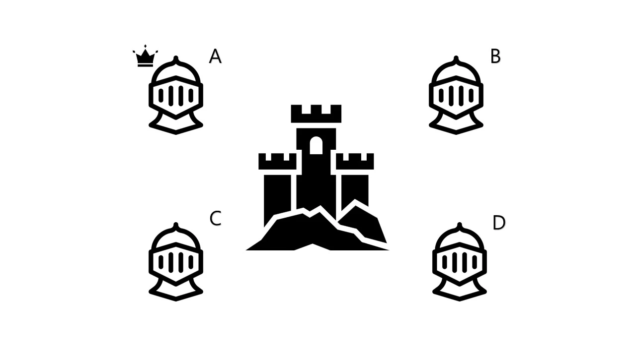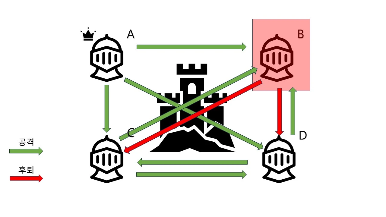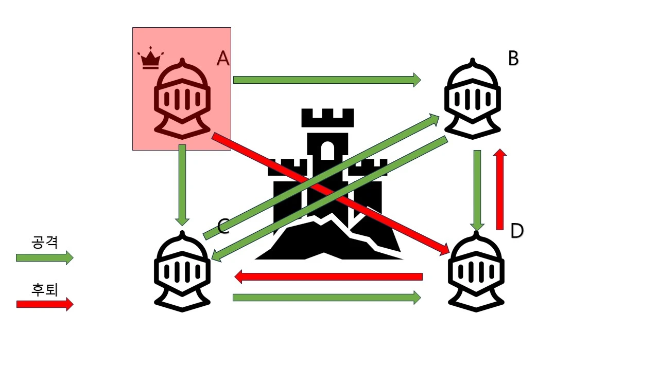 A는 사령관이며, 공격해서 성을 함락시키거나 후퇴 후 다음 기회를 노리기 위해서는 과반수, 즉 3명 이상이 공통된 지시에 합의해야 한다.