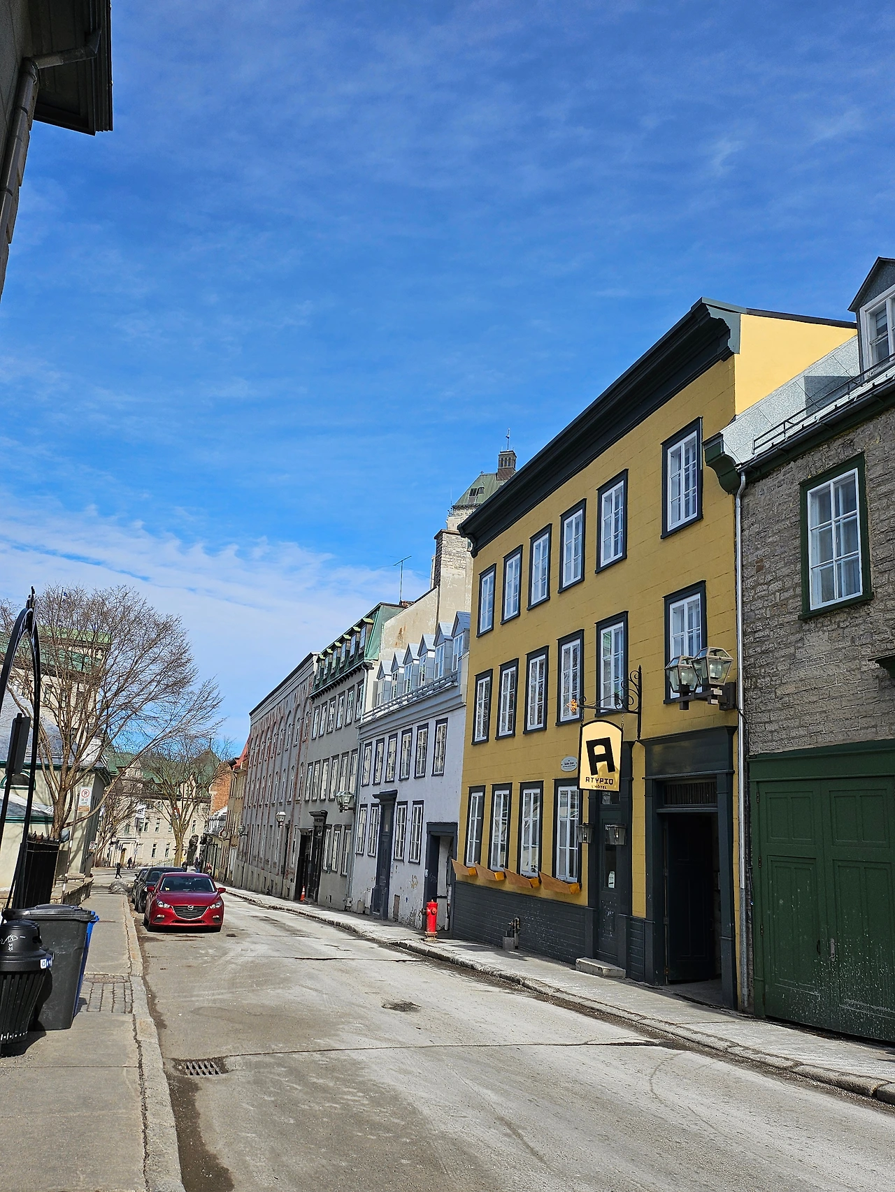 쌩딴 Sainte Anne 길과 뒤 트레조 Du Tresor 길이 만나는 곳에 3성급 호텔이 두 개가 있는데 하나는 오뗄 생딴이고 다른 하나가 바로 오베르주 뒤 트레조다. 빨강 지붕이 인상적인 이 호텔의 1층에는 Bistro 1640이라는 레스토랑이 있다. 왜 이름이 비스트로 1640인고 하면 물론 이 건물의 역사가 1640년까지 올라가기 때문이다. 그렇게 역사적인 건물인 만큼 위치도 구시가 한복판에 있다. 얼마나 중심에 가까우냐 하면, 구글에서 old quebec city로 검색하면 빨간색 풍선이 호텔 바로 옆에 찍힐 정도라고나 할까. 그리고 바로 뒤 트레조 길로 말하자면 주로 판화작품을 비롯해 작은 그림을 파는 노점상이 들어차 있는 작은 골목인데 아직 날이 추워서인지 문 연 곳이 하나도 없었다.