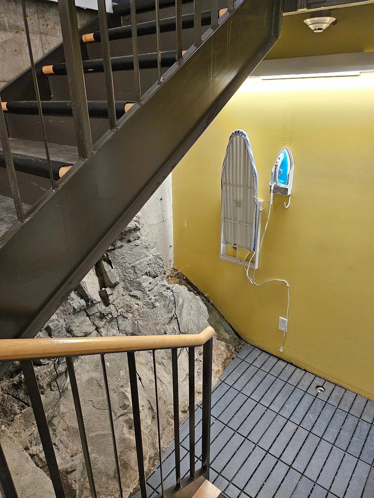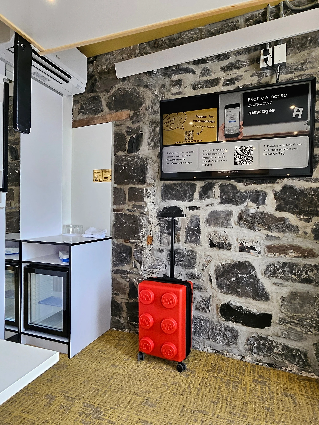 그렇게 찾아간 방은 문을 열고 들어선 순간, 사진으로는 몰랐던 사실을 알게 됐는데, 바로 문 열자마자 화장실이라는 것이었다. 침실이 작아서 낮에는 침대를 위에 올려야 한다는 건 알았지만 방으로 들어가기 위해서는 변기와 욕조 사이를 지나가야 한다는 건 몰랐다. 좀 당혹스럽기는 했어도 복도에서 나는 소리가 잠자리를 방해하는 것보다는 나을 것 같았다. 옛날 건물 구조를 그대로 활용한 돌벽과 유리문이 있는 미니 냉장고에 내 레고 캐리어가 묘하게 어울리는 방이었다.