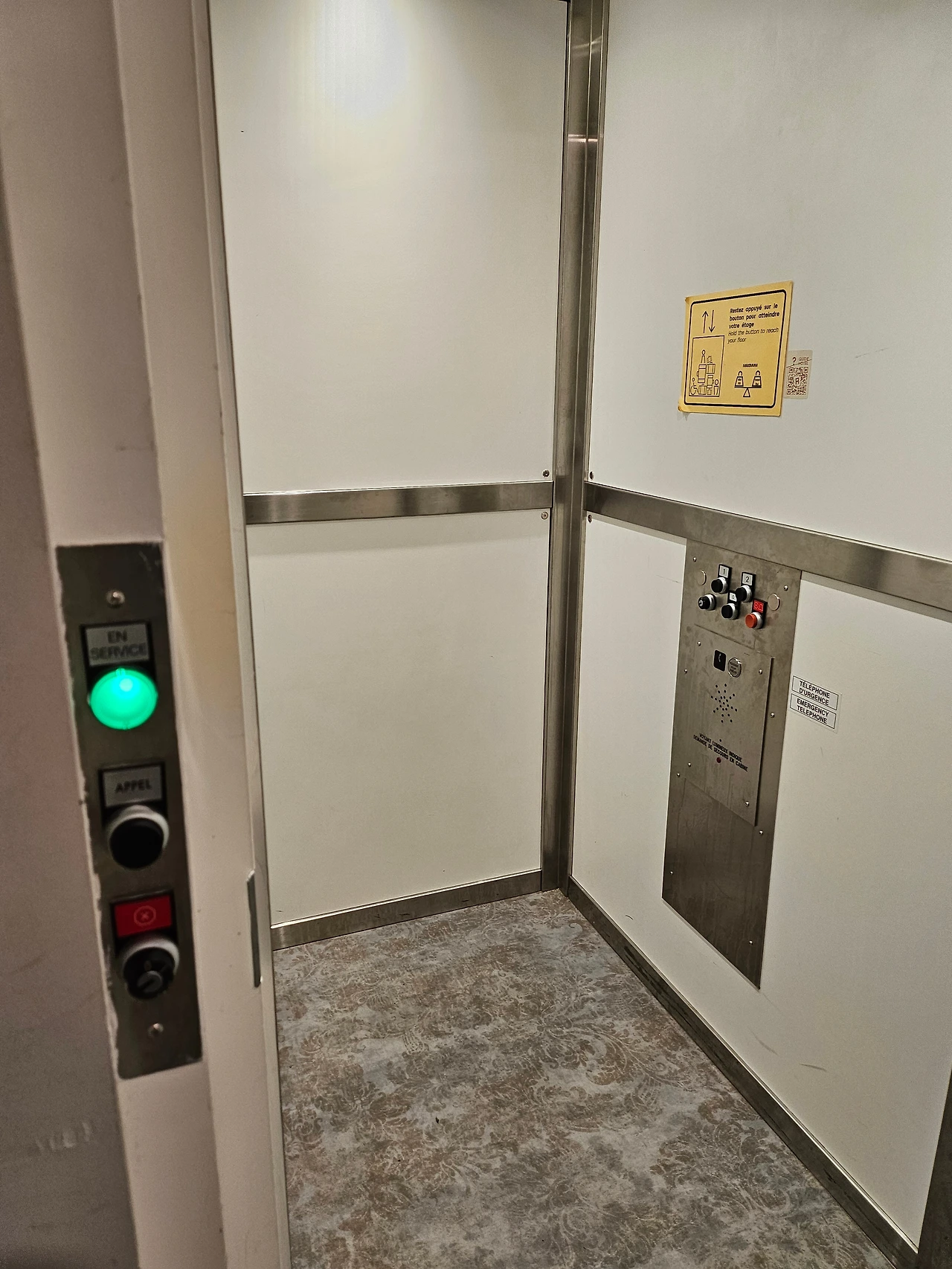 이름부터가 평범하지 않다는 뜻이라서 호기심을 갖게 되었던 호텔, 겉은 옛날 건물 그대로인데 안에는 레노베이션을 한 지 얼마 안 됐는지 깔끔하다. 방은 2층이었지만 짐 때문에 엘리베이터를 불렀는데 버튼을 아주 오래 눌러서야 겨우 도착했다. 문을 당겨서 열고 들어가서 올라가는 동안 벽에 몸이 갈릴까 봐 뒤에 바짝 붙어 섰다. 사람이 탈 게 못되는데, 그렇다고 짐만 보낼 수도 없는 엘리베이터.