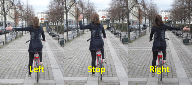 첫 연습은 너무도 처참했다. 위 그림과 같이 멈출 때에는 발표할 때처럼 손을 들고, 방향을 틀 때에는 좌측 우측으로 손을 뻗어야 하는데, 일차적으로 한 손을 떼고 페달을 굴리는 것이 불가능했기 때문에 신호를 줌과 동시에 넘어지는 것이었다. 뒤에서 걱정스레 지켜보던 친구는, "왼손을 든 건 좌회전이 아니라 좌측으로 곧 넘어질 거라는 시그널이니?"라며 웃었다. 아, 이래서는 곤란하다. 나는 회사 옆자리 동료에게 월요일이 되어도 내가 회사로 출근하지 않는다면 자전거 사고사로 알고 있으라며 유언 비슷한 것을 남겨두고 주말 동안 연습에 매진했다. 그렇게 며칠의 연습이 거듭된 후 나는 드디어 자전거와 한 몸이 되어 코펜하겐을 누비기 시작했다.