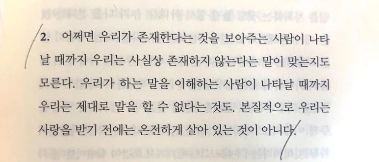 ‘어쩌면 우리가 존재한다는 것을 보아주는 사람이 나타날 때까지 우리는 사실상 존재하지 않는다는 말이 맞는지도 모른다.’ 알랭 드 보통 <왜 나는 너를 사랑하는가>의 한 구절이다. 연인 간의 사랑에 관한 이야기인데 그의 <불안>에서 이 구절의 의미는 확장된다. 주장을 조합하면 사람은 사랑에 관한 두 가지 결핍을 타고난다. 첫 번째는 연애적 사랑, 두 번째는 세상에게 받는 사랑이다.