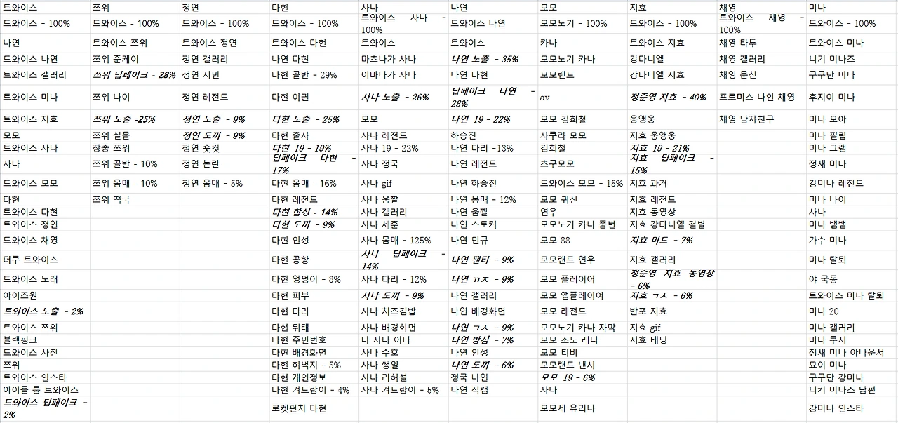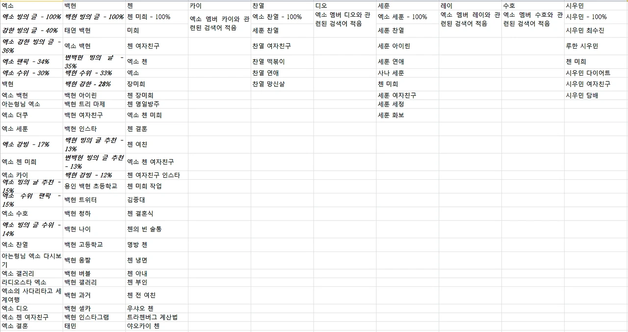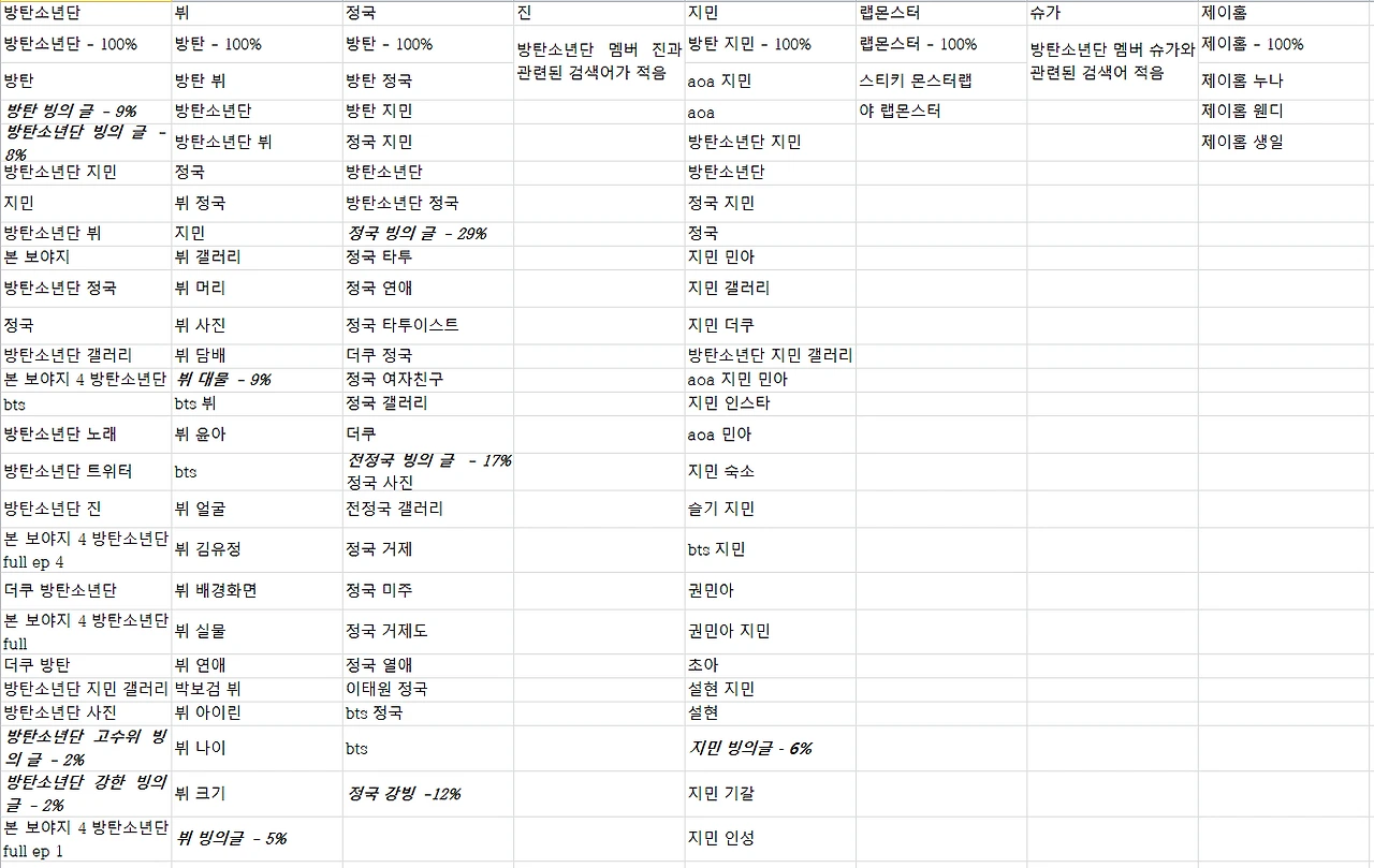 그룹명과 각 멤버를 구글 트렌드에 검색했고, 해당 사이트에서 제시하는 '키워드 관련 인기 검색어(최대25위)'를 엑셀로 정리했습니다. 개인 기준으로 몇몇 아이돌은 유효한 관련 검색어가 매우 적거나 없어서 표기해두었습니다. 극단적인 예로 블랙핑크의 멤버 '지수'를 검색하면, 코스피와 코스닥 등의 주가지수만이 유효 관련검색어로 나타납니다. 이와 같은 교란 요인으로 관련검색어를 얻지 못한 경우가 있습니다. 특히 GOT7 멤버들의 이름은 구글 트렌드 통계에 제대로 잡히지 않아 따로 정리하지 않았습니다.
