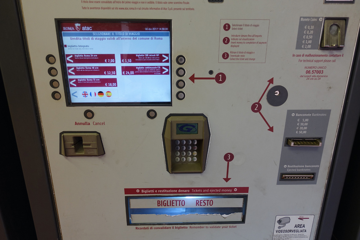 이탈리아의 대중교통권은 다른 나라에 비해 간단하게 구입이 가능하다. 내가 가는 곳이 몇 존(Zone)인지 고려할 필요 없다. 그냥 이용시간만 선택하면 된다. 교통권은 주로 지하철역이나 버스정류장 근처 가판에서 구입이 가능한데 이 티켓으로 모든 대중교통 이용이 가능하다. (담배파는 곳에서도 판다.)