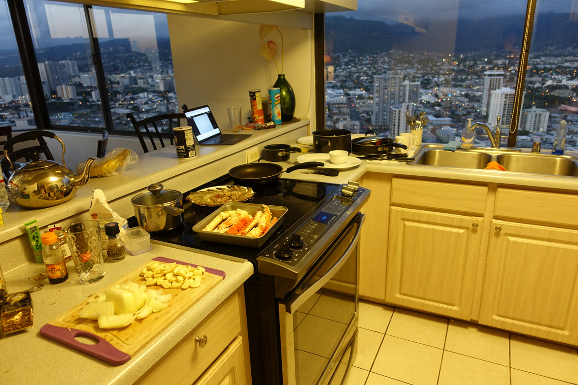 이번 숙소의 가장 좋은 점은 완벽한 주방이다. 어지간한 도구들이 다 있다. 도마가 없어 피자박스에 대고 감자를 썰던 시절은 이제 옛날이야기다. 게다가 한국에서 온 간장을 비롯한 조미료들도 넘친다. 천군만마를 얻은 기분을 요즘 알 것 같다.