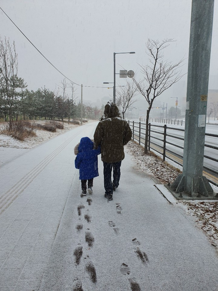 13일 함박눈이 내렸다. 일요일 모처럼 늦잠을 청하려던 찰나, 아내가 이불을 걷고 일으켜 세운다. 5살 아들에게 '눈'을 선물하잔다. 전날 늦게 잠이 들었던 터라 피곤함이 가시지 않았다. 내심 집콕을 원했지만, '아이를 위한다'는 불문율에 천근만근 몸을 이끌고 밖을 나선다.