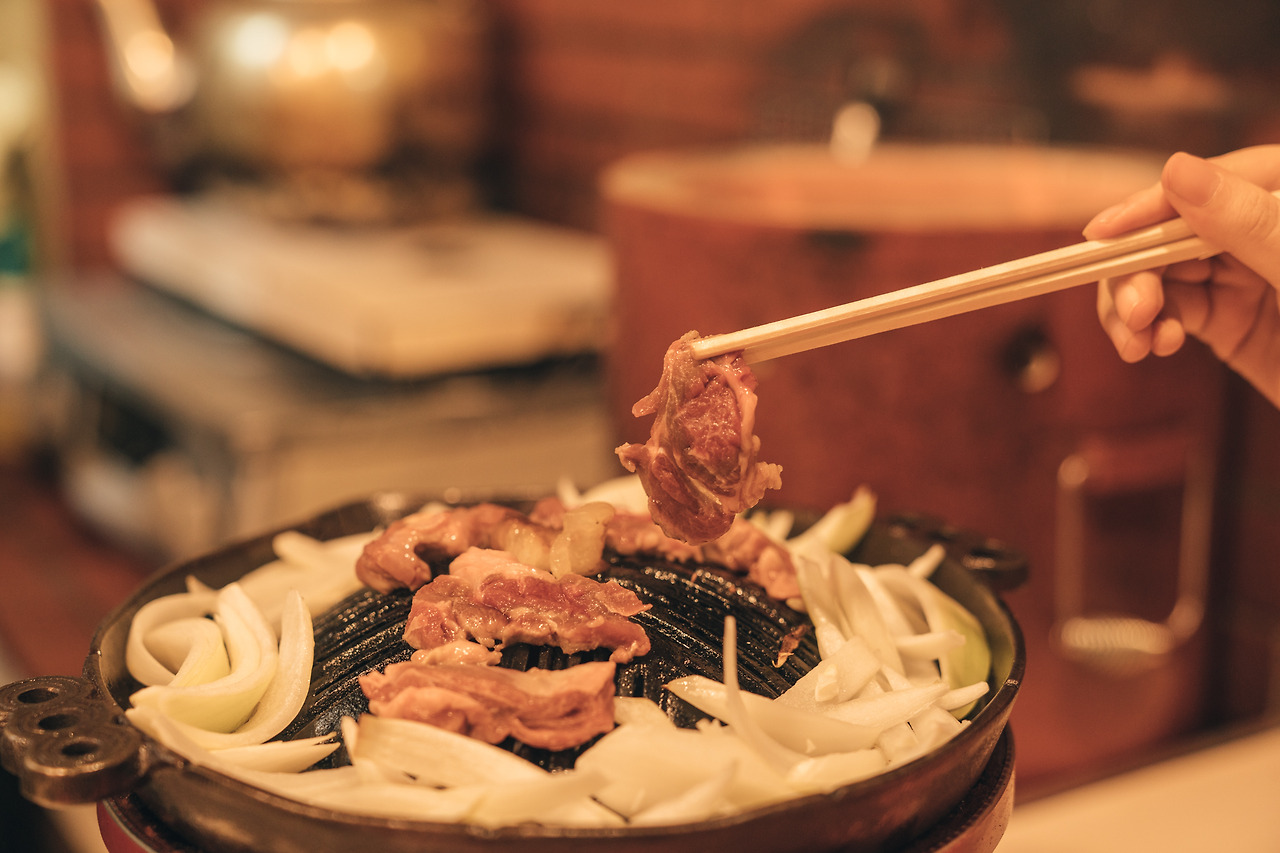 이게 징기스칸이다. 둘이서 먹기 좋은 작은 화로에 양파와 양고기를 구워준다. 사이드 메뉴를 시키면 소세지 등 다른 메뉴도 시킬 수 있다.
