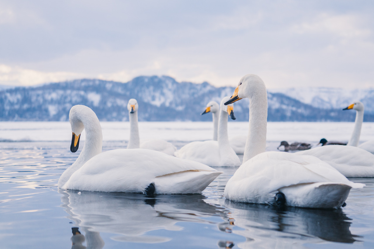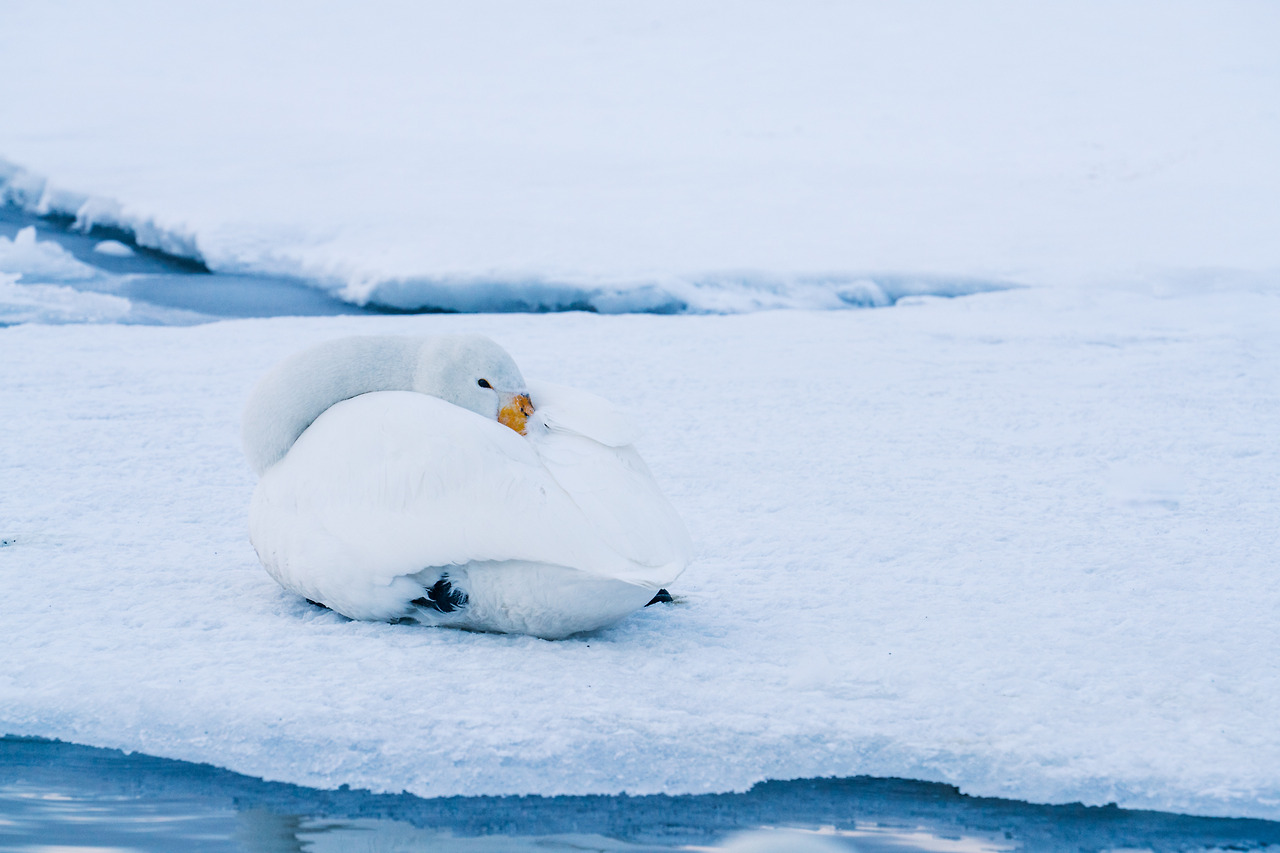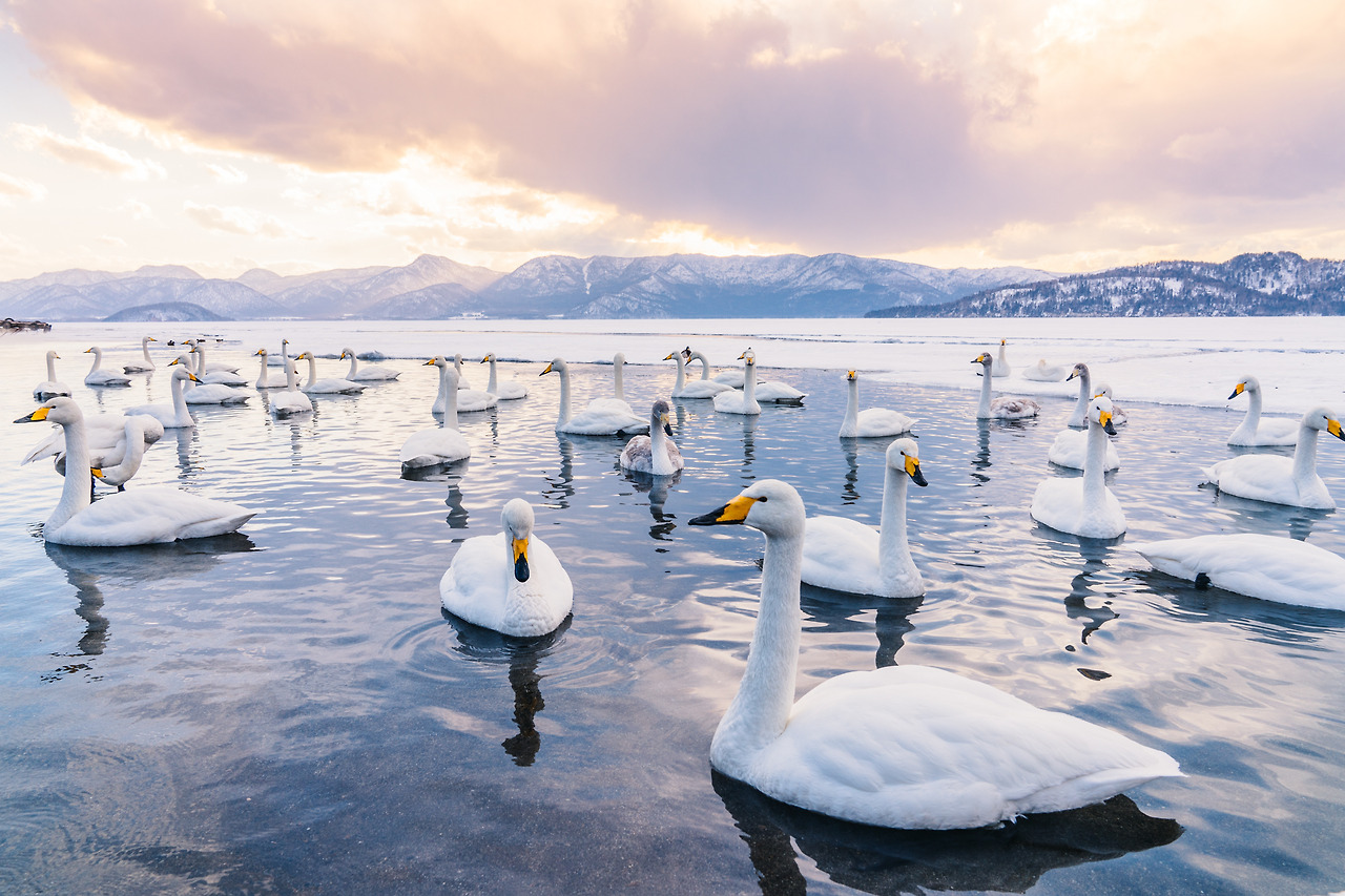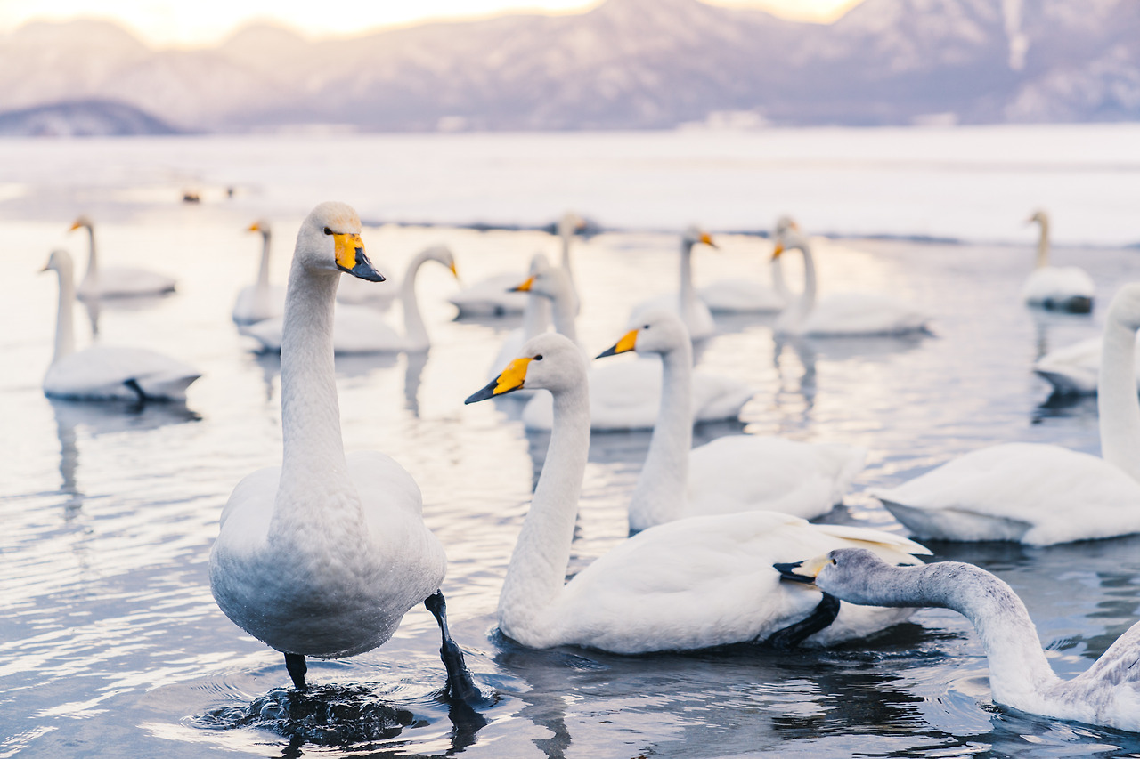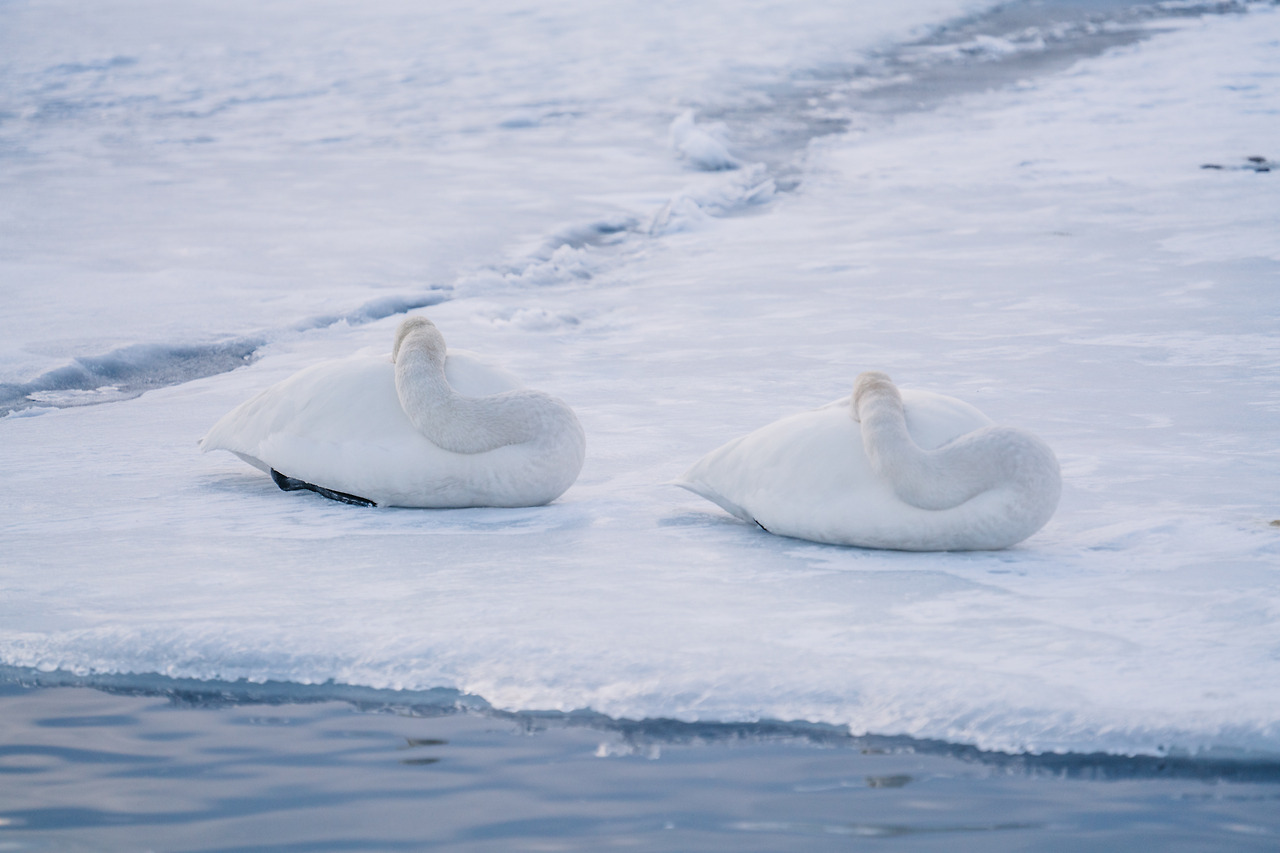 홋카이도의 겨울은 물론 춥지만 셔터를 누르기 위해 움직여서 그랬을까 노을이 지는 밤이와도 크게 춥진 않았다. 아무래도 온천수 때문인 것 같았다. 러시아에 살다가 따뜻한 곳을 찾아 이곳으로 오는 고니들이 새삼 귀여웠다. 이녀석들에겐 이곳은 '찜질방'과 다름없다.