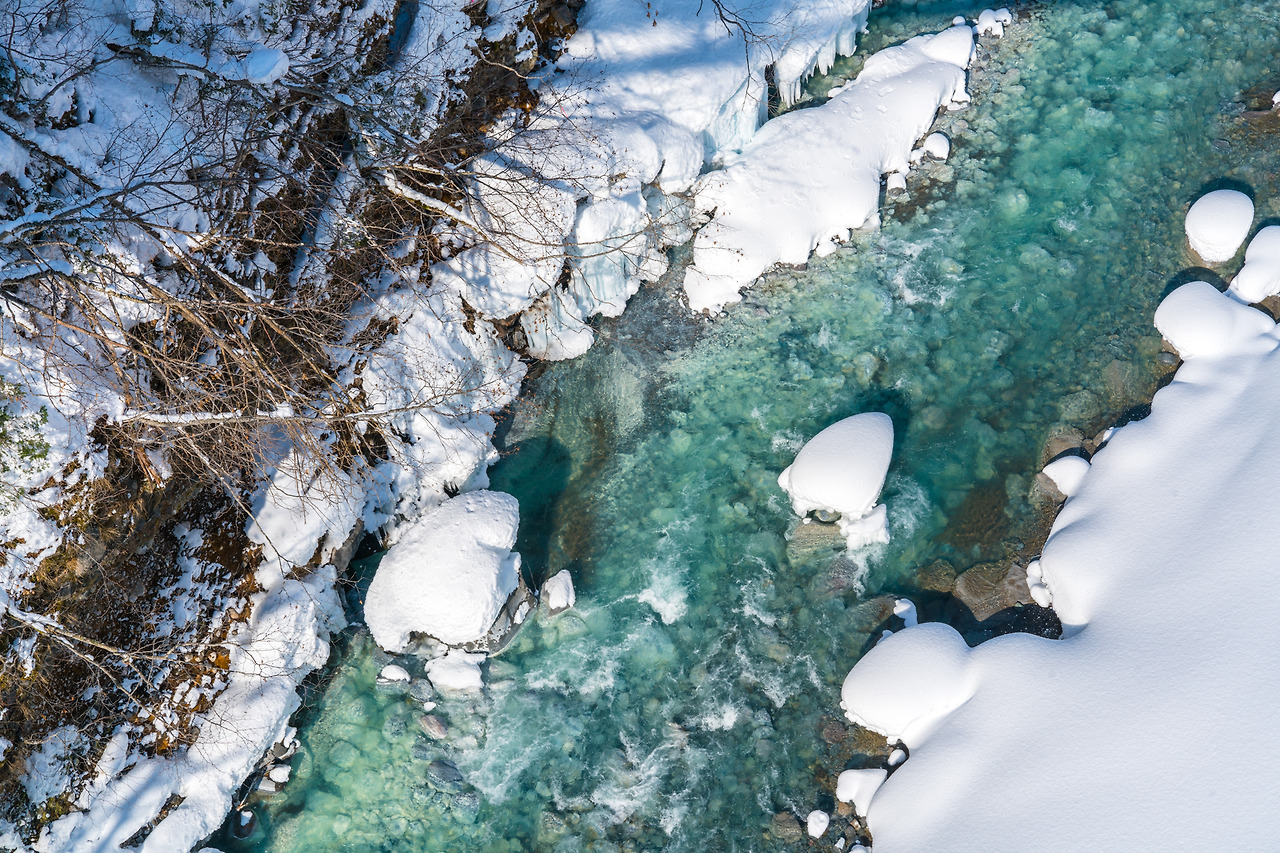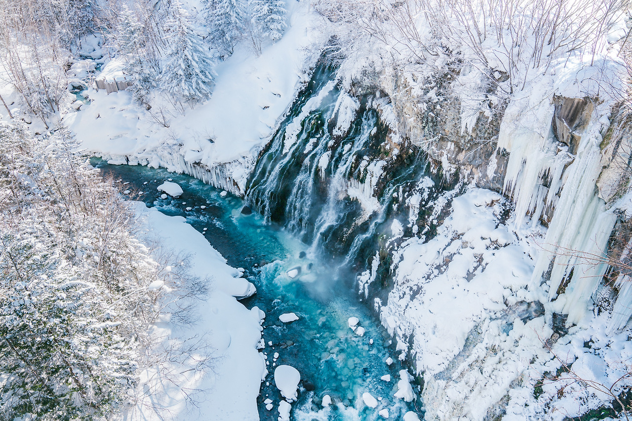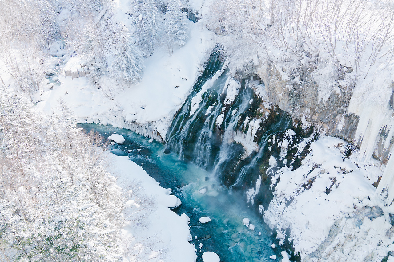흰수염 폭포에선 뜨거운 온수가 흘러내려 겨울에도 얼지않아 맑고 푸르른 물줄기와 이렇게 하얀 눈과 고드름을 함께 담을 수 있다.