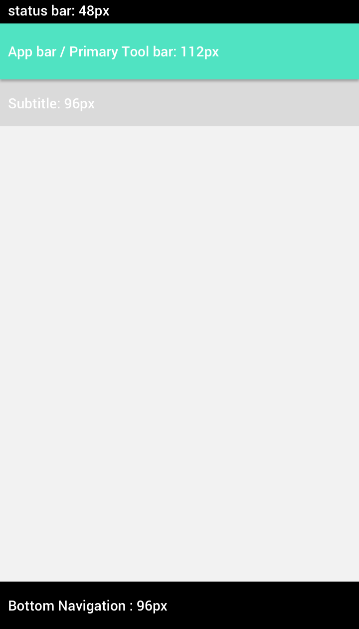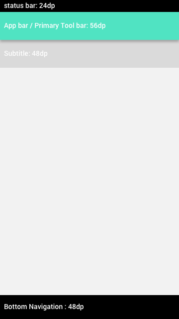 안드로이드를 디자인할 때, dp값이 정해져 있는 요소들이 있습니다. Status bar, App bar(Primary tool bar), Bottom Navigation 등은 가로와 세로의 dp값이 정해져 있습니다. 아래에 추가 정리하겠습니다.