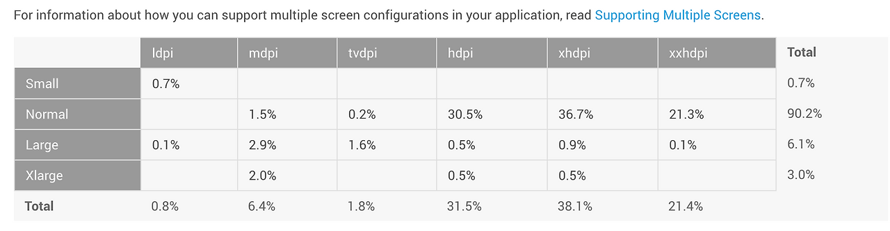 실제 안드로이드 측에서 제공하는 통계를 보면 보통 스크린 사이즈에 hdpi 혹은 xhdpi, xxhdpi를 많이 사용하고 있습니다. UI 디자인 시에 mdpi를 기준으로 작업하더라도 결국 후에는 hdpi, xxhdpi에서 사용된다는 것을 생각해두시면 좋을 것 같습니다.