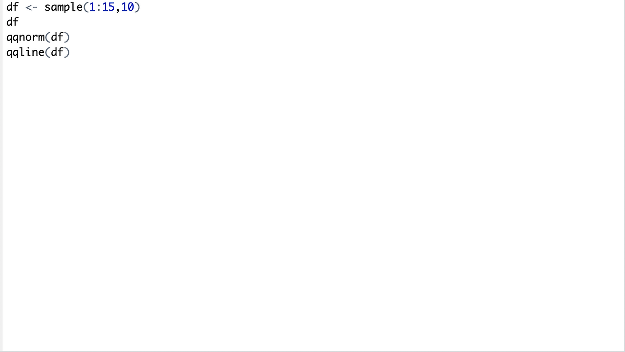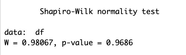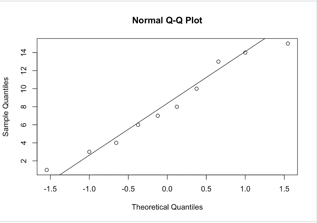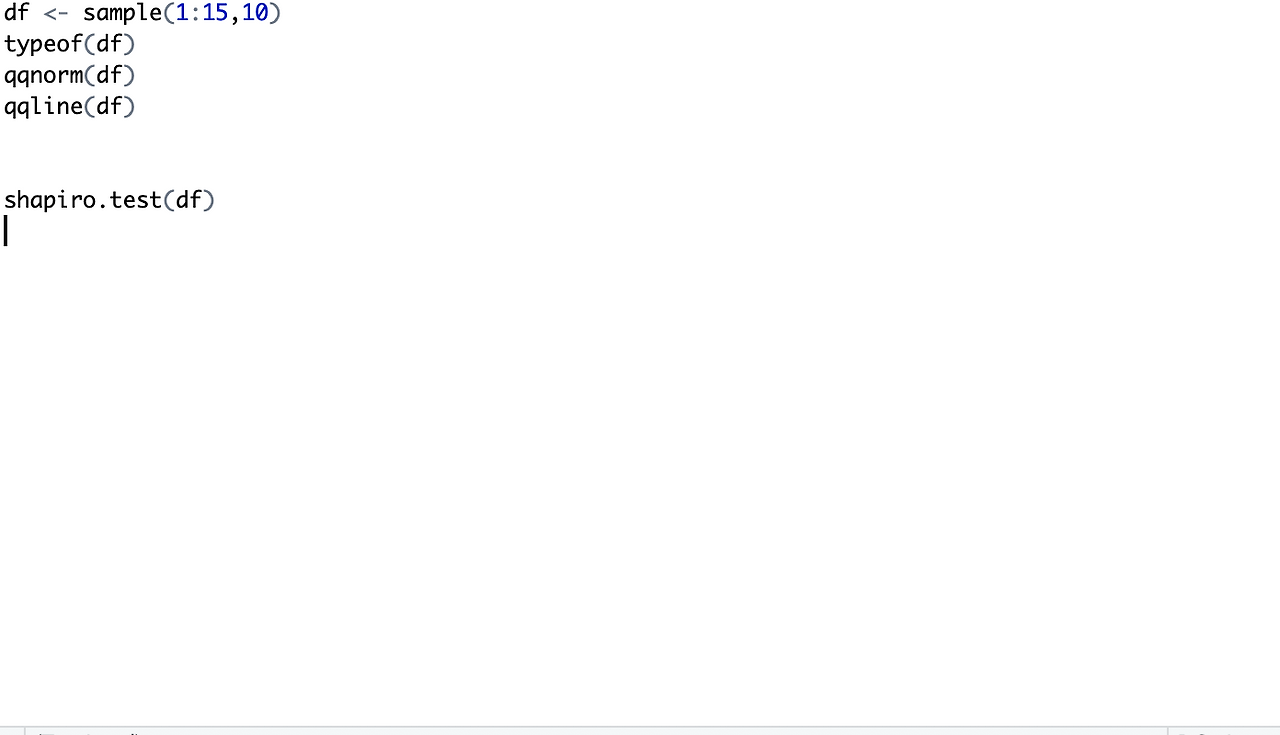 sample은 랜덤 한 숫자를 만들어 내는 함수로 1:15는 1에서 15까지, 뒤에 10은 10개의 숫자를 만들어내는 것을 의미한다. 그리고 이를 df라는 변수에 저장한다. 뒤에 df라고 한 번 더 입력을 한 것은 확인용이다. qqnorm과 qqline을 입력하면 오른쪽의 그래프가 만들어진다. 선 위에 점이 밀집되어 있을수록 정규분포를 따르는 것이다. 그런데 이렇게 되면 시각적으로 정규분포를 얼마나 따르는지 해석할 수밖에 없다. 즉 정확히 정규분포를 따르는지 알 수가 없다. 이를 해결하기 위해 나온 함수가 shapiro.test()이다.