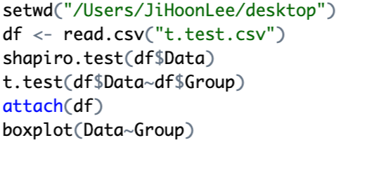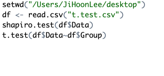 왼쪽과 같이 shapiro test를 시행하면 오른쪽과 같이 결괏값이 나온다. 이때 p-value(유의 수준)이 0.05 이상이면 정규분포를 따른다고 볼 수 있다. 헷갈리지 말아야 할 것은 shaipro test의 귀무가설이 '수집된 데이터가 정규 분포를 따른다.' 이므로 p-value가 0.05보다 커야 귀무가설을 기각하지 않게 되어 정규분포를 따름을 확인할 수 있다. 요약하자면 p-value가 0.05보다 크면 t.test를 시행할 수 있다. qqnorm과 qqline을 시행하기 전에 shapiro test를 시행하면 조금 더 빨리 결괏값을 확인할 수 있다. 만약 정규분포를 따르지 않는다면 Wilcoxon test라는 다른 방법을 사용하면 된다. 연속형 변수일 때는 대부분 정규분포를 따르는 경우가 많다.