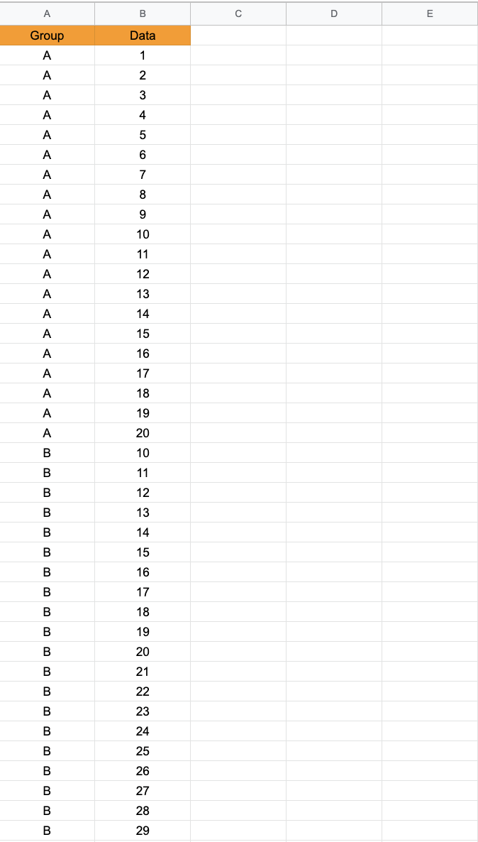 그런데 이 CSV 포맷은 shaipro test를 실행하기 쉽지 않다. 따라서 아래 방법을 추천한다. 칼럼을 그룹과 데이터로 나누는 것이다.