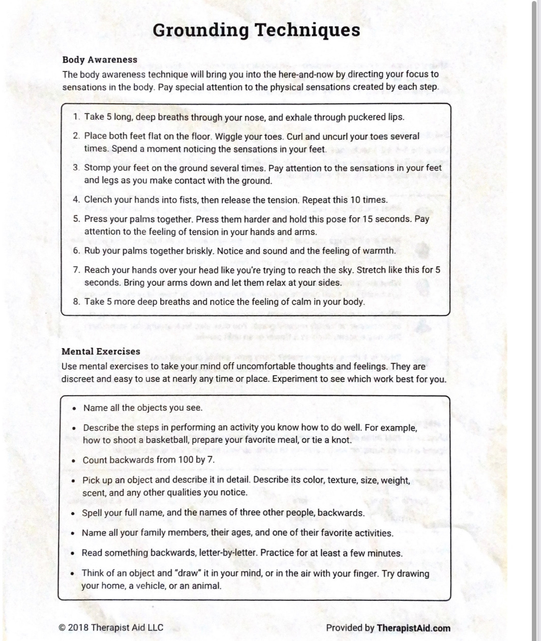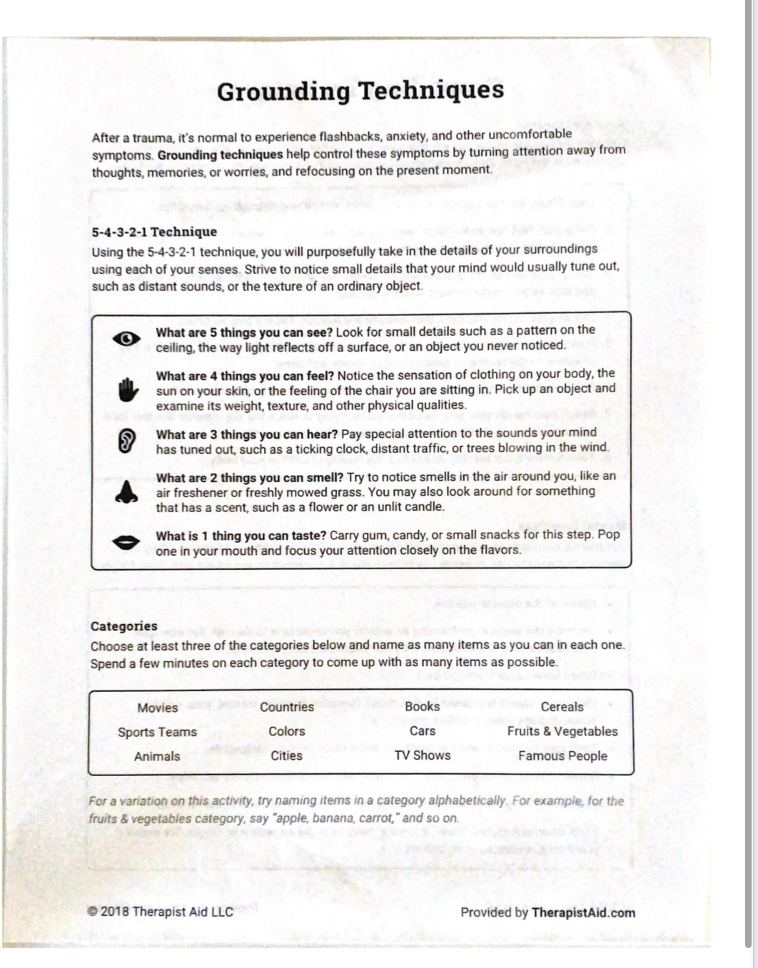 무언가 정말 내가 감당할 수 없는 생각이 들 때 "지금 이 시각, 나"에게 집중하는 순간인 Grounding Technique도 도움이 많이 되었다. 불안감이 엄습할 때 내 호흡에 집중한다던지 아니면 내가 보고 있는 것 5개, 느끼고 있는 것 4개, 듣는 것 3개, 맡고 있는 냄새 2개, 지금 느끼는 맛 1개를 생각하면서 현재의 환경에 집중해 보는 것이다.