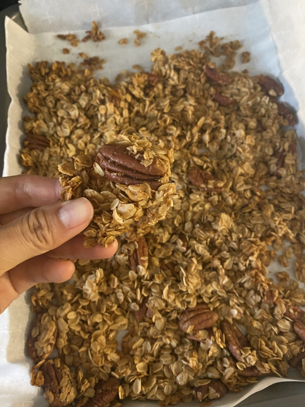 이곳에 와서 그래놀라 종류가 정말 많아서 처음에는 많이 사 먹었다. 체중 증가의 8할을 담당한 그래놀라. 아무리 몸에 좋아도 '질보다 양이 다이어트에서는 중요하다'는걸 새삼 알게 되었다. 집에서 만드는 그래놀라는 생각보다 정말 쉽다. 그리고 굽는 내내 집안에 향기로운 향이 많이 나서 좋다 :) 베이킹의 장점! 미국은 피칸의 나라니깐, 코스트코에서 구매한 오트와 피칸, 꿀을 넣어 만들었다. 소금은 개인적으로 sea salt보다 히말라야 핑크 솔트를 좋아해서 갈아서 넣는다.
