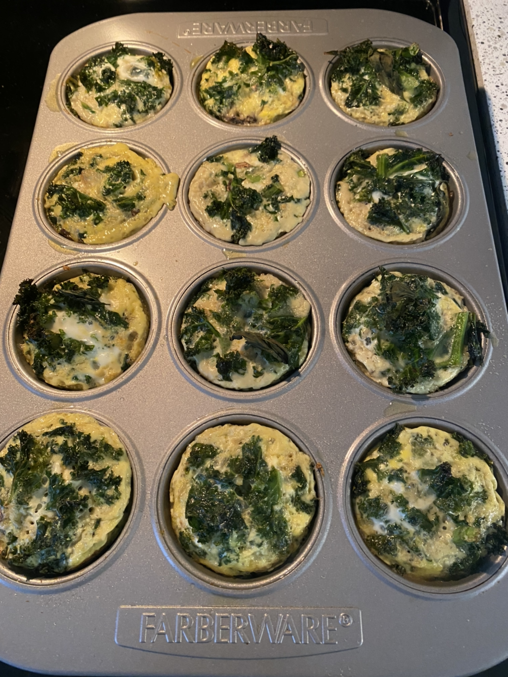 재료는 한 칸에 계란 1개씩 반쯤 붓고, 취향에 맞는 야채/치즈 넣기 > 350F/ 20 min