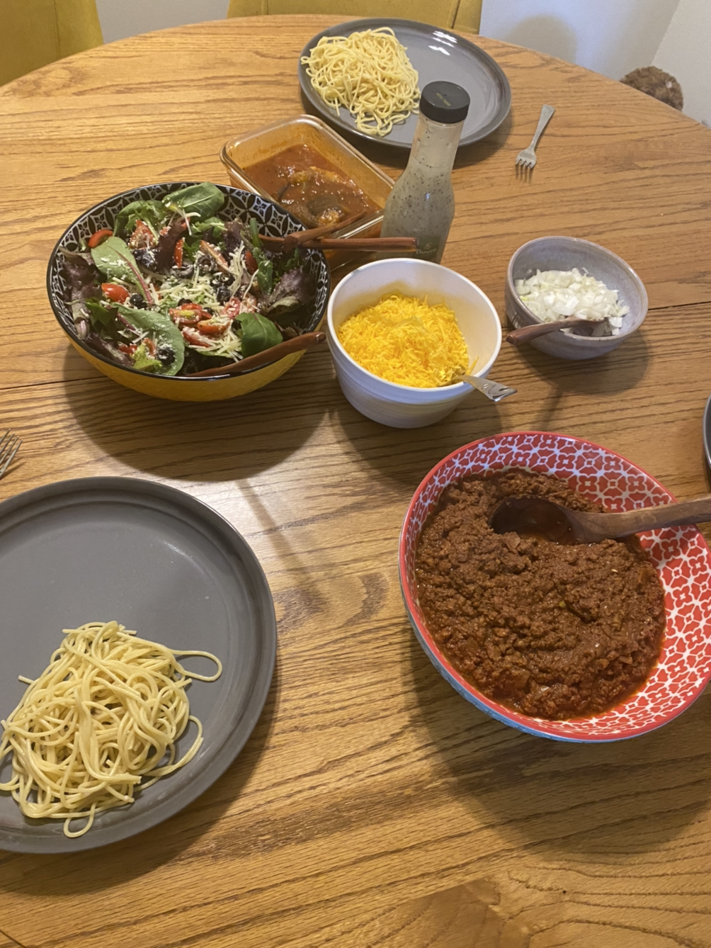 지역 특산 요리처럼 신시내티 (Cincinnati, 오하이오 주에 있는 도시)에는 칠리와 신시내티 스파게티가 있다고 한다. 1922년 그리스 이민자가 신시내티에 와서 만들고 레스토랑을 오픈해서 신시내티에 가면 꼭 먹어야 할 대표 음식이 되었다고 한다. 오하이오에서 석사를 마치고 온 동기가 만든 신시내티 칠리 스파게티.