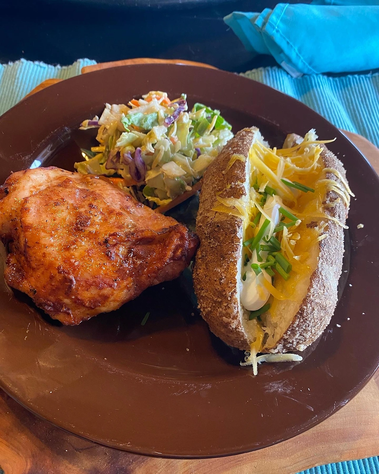 유타에 있는 친구 부모님 댁에 놀러 갔을 때 치킨 바비큐와 베이크 포테이토, 샐러드. 아마 흔히 생각할 수 있는 미국 음식이 아닐까.