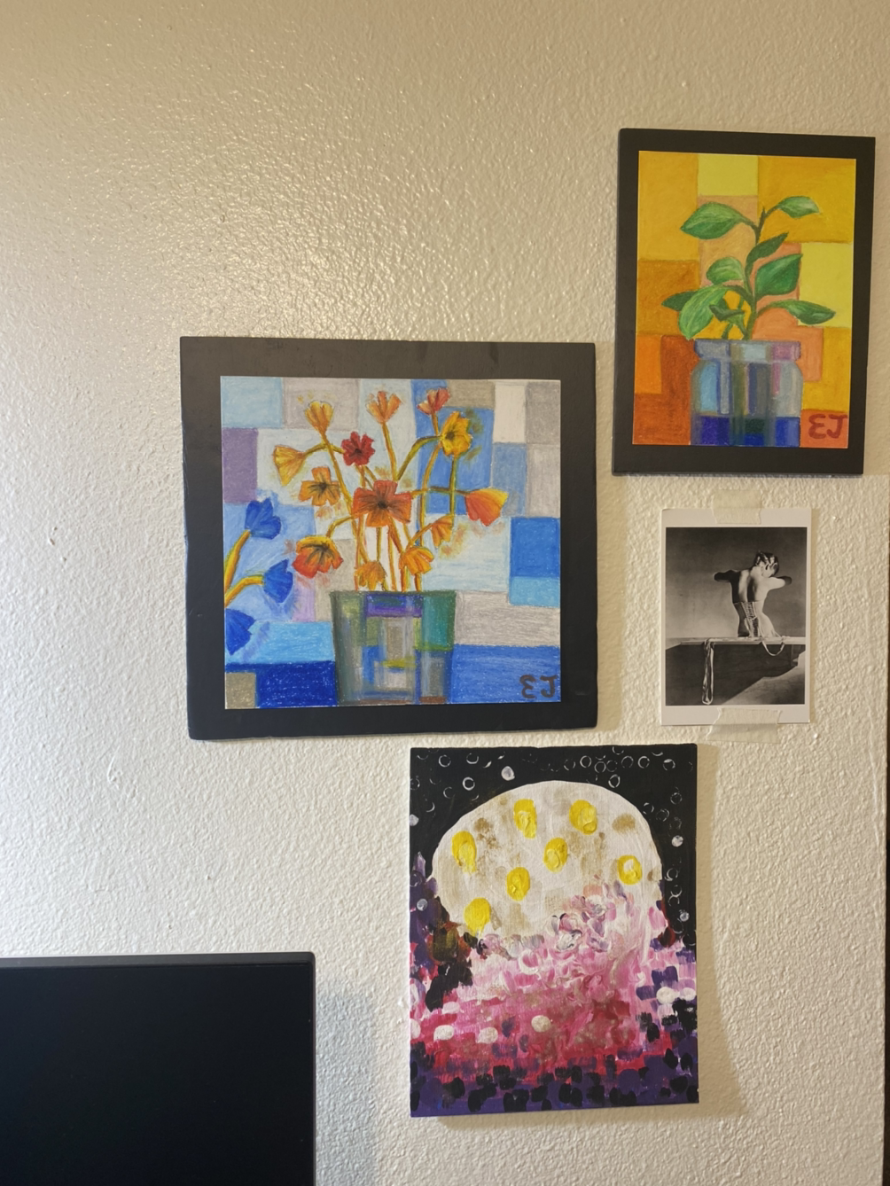 한국 박사 과정 친구 중 취미로 그림을 그리는 친구는 손수 그린 그림 두 점을 선물해줬다. 간혹 학교에서 같이 그림을 그리기도 하고 전시를 하기도 하고 전시를 보기도 한다. 정성 가득히 그린 그림을 모니터 위에 붙여놨다.