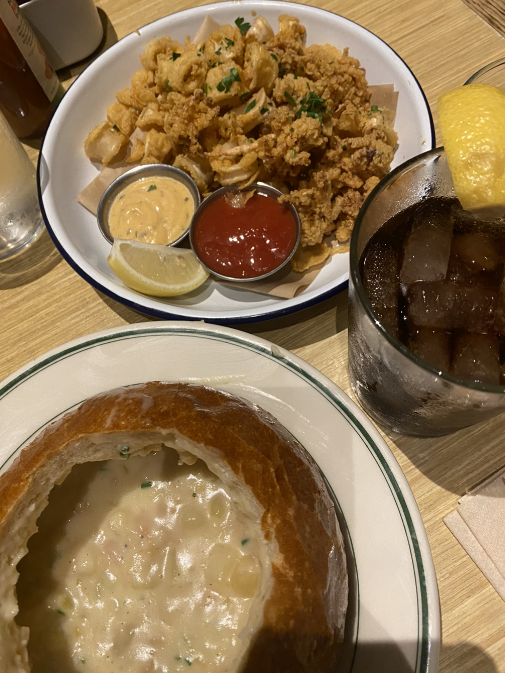저녁은 샌프란에 오면 먹어야 하는 클램 차우더 수프와 칼라마리, 해산물 파스타를 시켰다. 시애틀, 포틀랜드 등 서부 위쪽 항구 도시들은 항상 클램 차우더 수프가 유명하다. 샌프란에서 피어 39에서 먹기도 하지만, 우리는 다운타운에서 먹었는데 맛있었다. 샌프란시스코의 유명한 사워도우 빵 안에 있는 클램 차우더를 시켰다. Boudin Sourdough와 같이 사워도우 빵은 샌프란시스코의 지역 특산물인데 샌프란의 안개 끼는 기후가 이스트 발효 등을 잘 시켜서 오래전부터 유명하다고 한다.