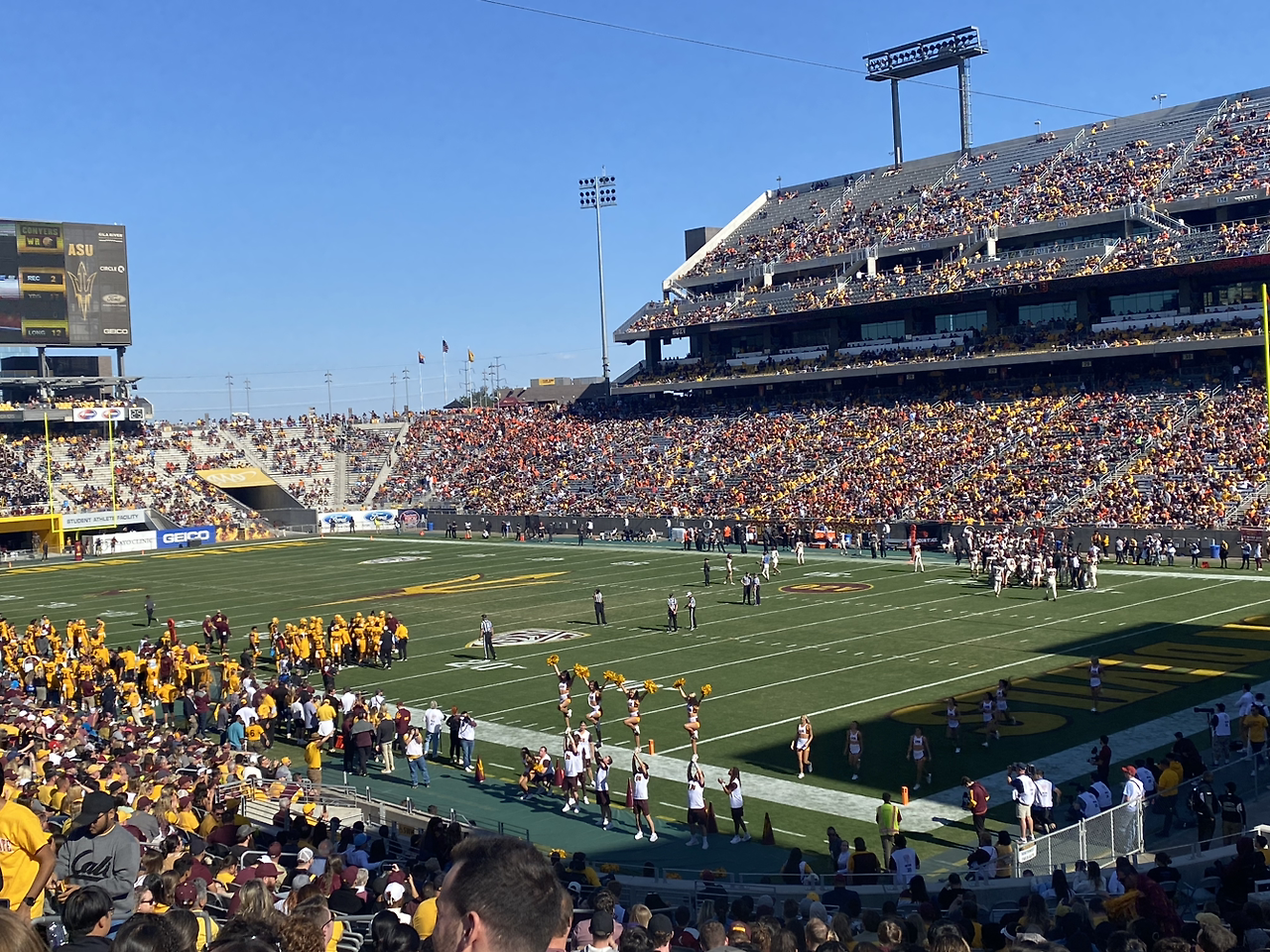 치어리더들이 큰 경기장 각 세 곳에서 열심히 응원을 펼친다. 경기장에만 있어도, 사진만 찍어도 풋볼 경기장은 '참 미국스럽다'라는 말이 나올 만큼 미국 문화와 색이 보인다.