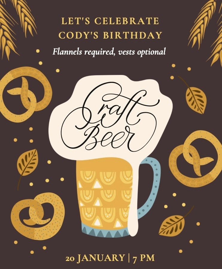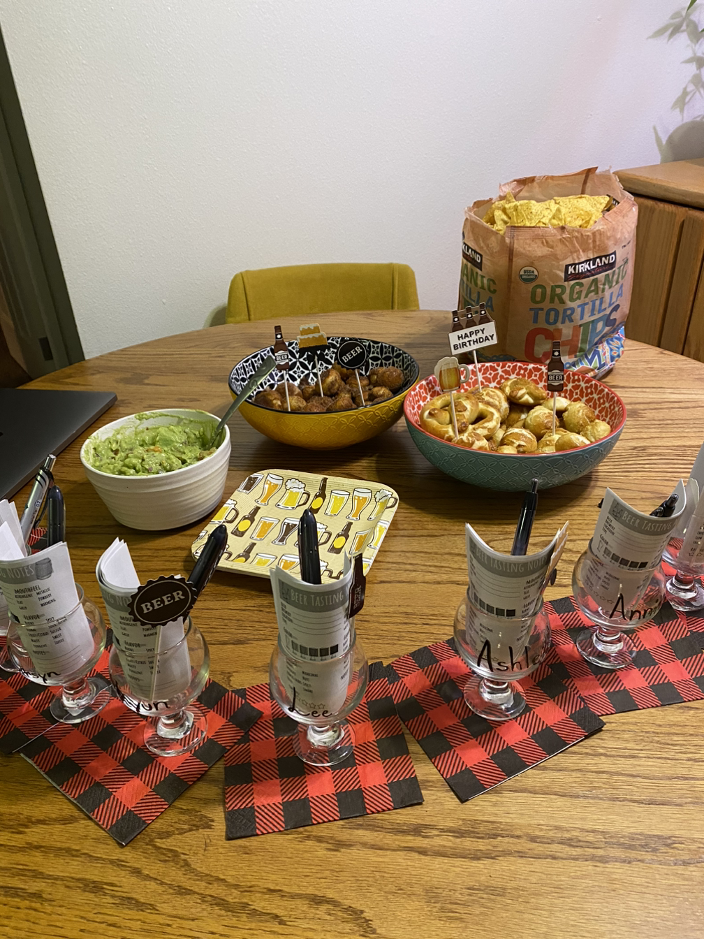 초대장은 파티 2주 정도 전에 날아왔다. (아.. 곧 다가올 내 생일은 어떻게 같이 축하 자리를 만들어야 할지 고민이다.) 맥주를 좋아하는 친구라서 주제는 Craft beer에 드레스코드도 flannels 체크무늬 셔츠이다. 실제로 역사 박사 학위로 졸업을 하는 친구인데 맥주 제조할 때 들어가는 홉 (hop)과 브루어리 역사를 박사 논문 (dissertation)으로 썼다. 그래서 생일 파티도 주제가 맥주이고 맥주 테이스팅도 함께 하고 맥주와 함께 먹을 프레즐과 같은 핑거 푸드와 홈메이드 더치초콜릿케이크로 축하 자리를 만들었다.