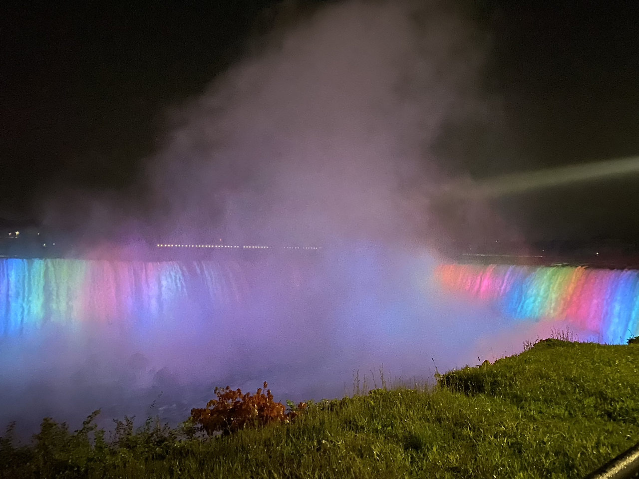 처음 보는 밤의 나이아가라 폭포는 웅장하고 엄청난 스케일에 압도당하는 느낌이다. 폭포 떨어지는 소리와 함께 밤에 보는 거대한 폭포가 조금 무서웠다. 물안개가 부슬비처럼 떨어진다. 조명색이 바뀌면서 비쳐서 무지개로 보이는 폭포가 예쁘다.