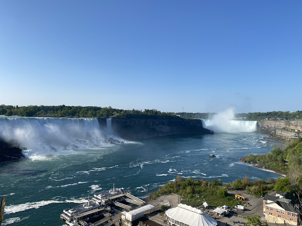 아침 일찍 일어나 나이아가라 폭포로 산책을 했다. 밤에 보는 풍경과 또 다르다. 역시나 장관이고, 낮에 보는 폭포가 더 멋지다. 아침 일찍이라 그런지 사람들이 많지는 않았다. 폭포가 떨어지는 지점을 옆에서 볼 수 있는 캐나다 나이아가라까지 걸어서 물이 쏟아지는 곳을 보았다. 물이 떨어지는 힘 때문에 지형이 변하고 깎이어서 폭포가 떨어지는 지점이 점점 뒤로 밀려 말발굽처럼 된다고 한다. 또 나이아가라 폭포 근처의 관광지는 200년 전부터 변하지 않는다고 한다. 예전의 모습을 유지하는 것이 개인적으로 좋아 보인다. 근처에서 친구와 마지막 브런치를 먹고 이제 미국에 가는 공항으로 왔다.